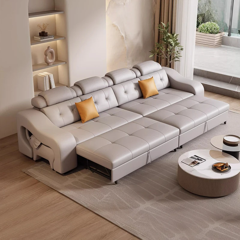 壁に寄り添う高級本革電動多機能ソファベッド - モダン&シンプルデザイン、折りたたみ収納機能付きでお部屋をスッキリ!リビングに最適な2WAYソファです。