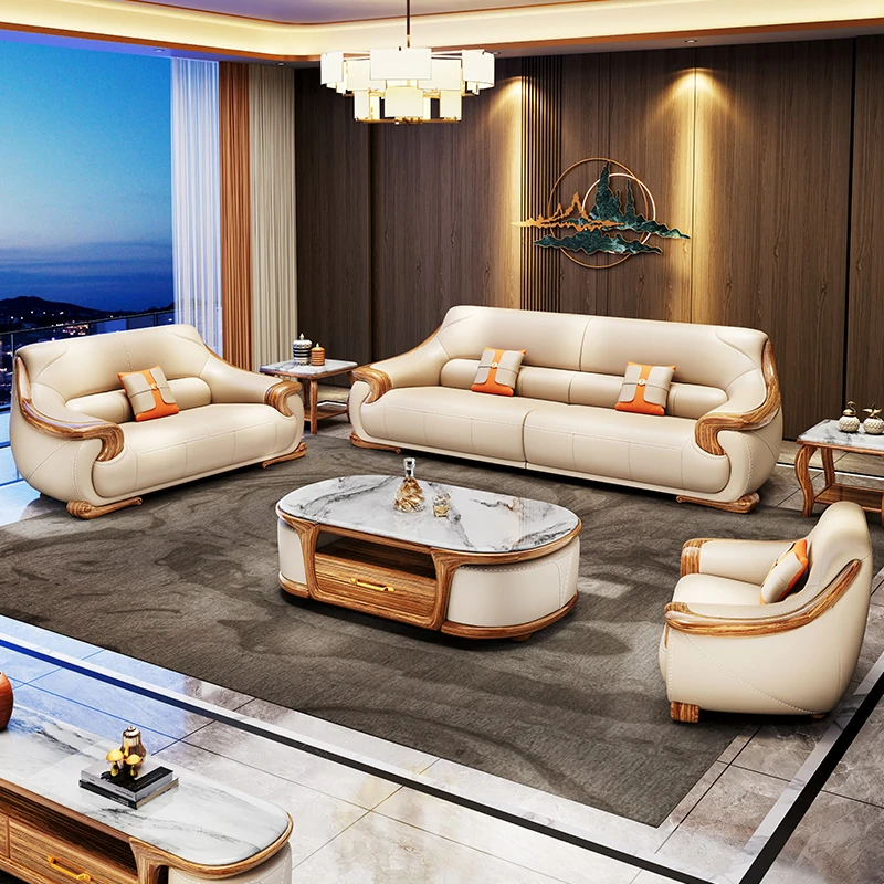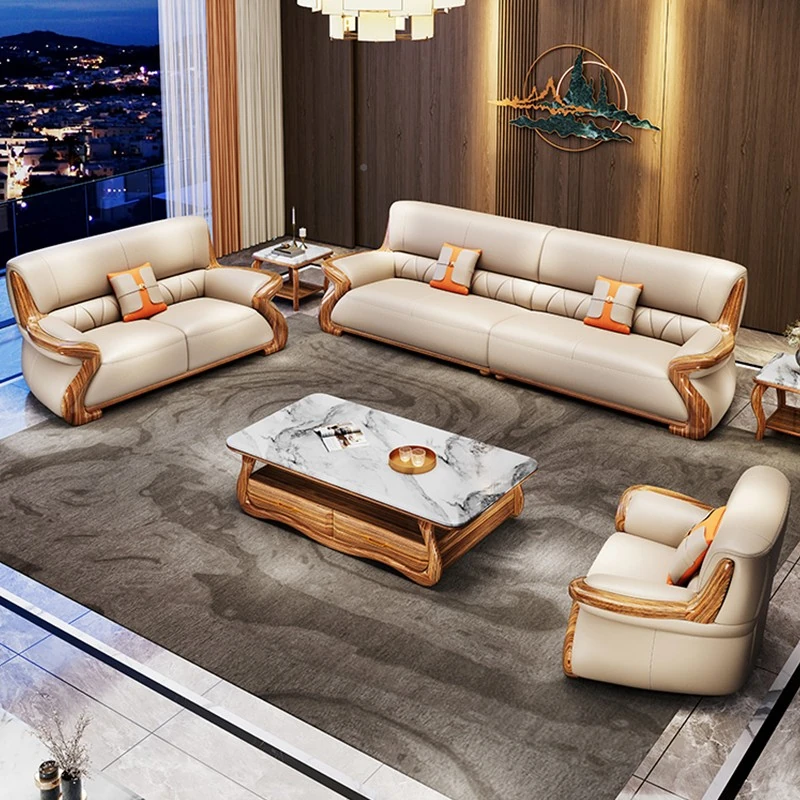 ウッドグレインレザーソファ1234組合 - 新中式デザインの高品質無垢材使用、モダンでシンプルな厚皮家具。リビングルームにぴったりの新作コンボ!
