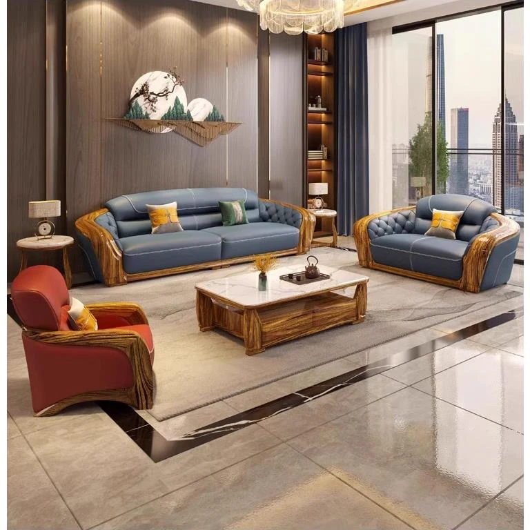 新中式ウッドブラックソファー本革リビングルームセット - 高級ヴィラ向けの豪華でモダンな欧風無垢材家具。快適さと洗練されたデザインを兼ね備えた一品で、あなたの生活空間を格上げします!