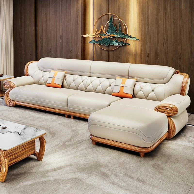 2024年新作!新中式デザインのウッ金木製レザーコーナーソファ。モダンでシンプルなリビングにぴったり。最高級の本革と無垢材使用で、贅沢な座り心地を実現!