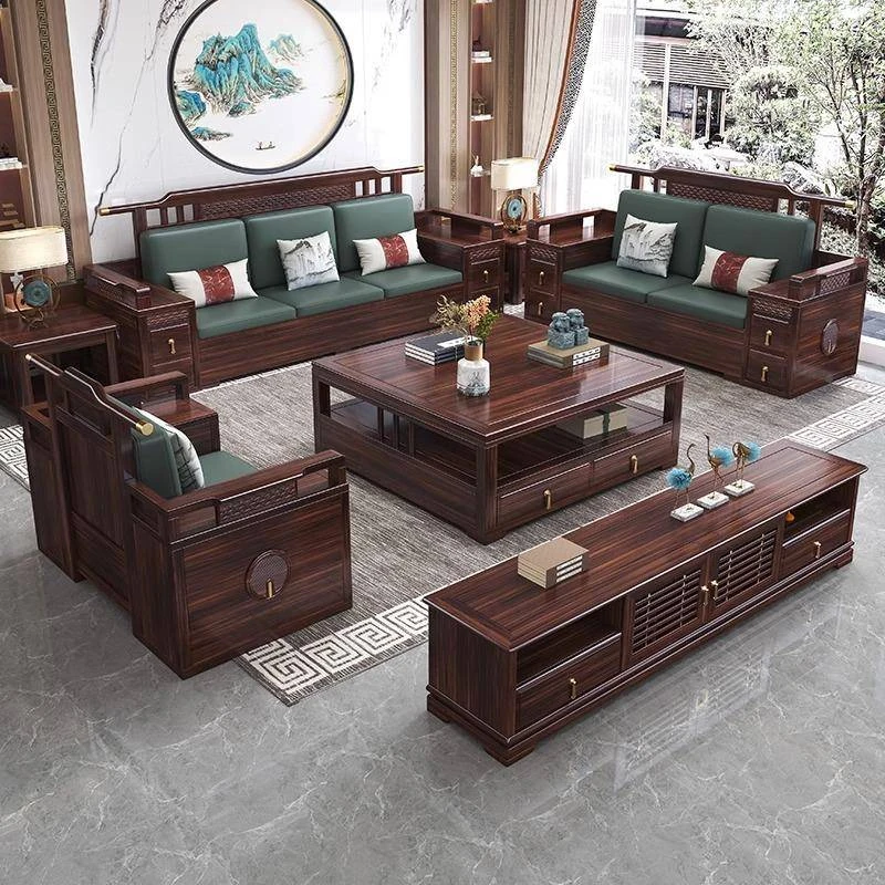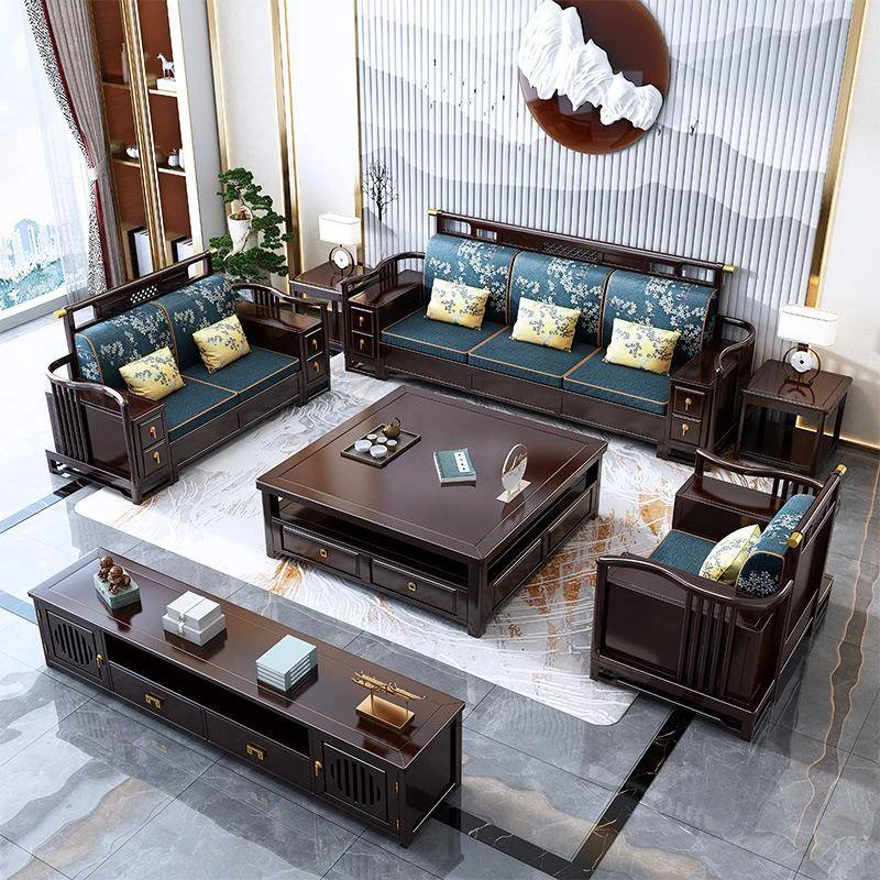 新中式実木ソファ モダンミニマリスト 中国風 古典的な禅の雰囲気を持つリビング収納ソファ ヴィラ向けソファセットで、スタイリッシュで快適な空間を演出!