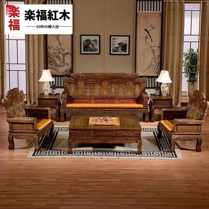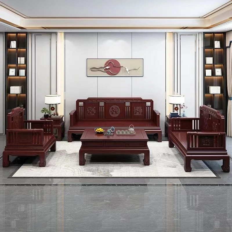 新作!中式ニ紫檀紅木全木製ソファー、大小兼用に最適な客室用コンビネーション、印象的なアンティーク調の彫刻ZN-0で、優雅な空間を演出します。