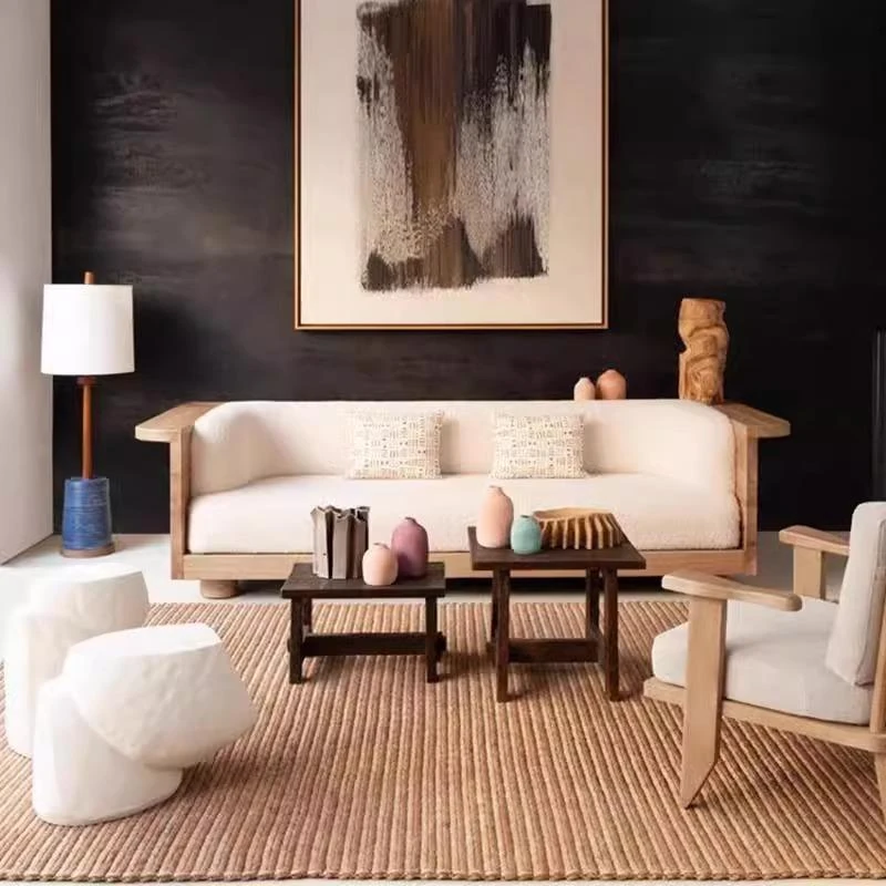 シンプルな新中式デザインの無垢材ソファ|小型アパートやホテルに最適な冬夏兼用ソファセット|薄型クッションで快適なリビング家具を実現!