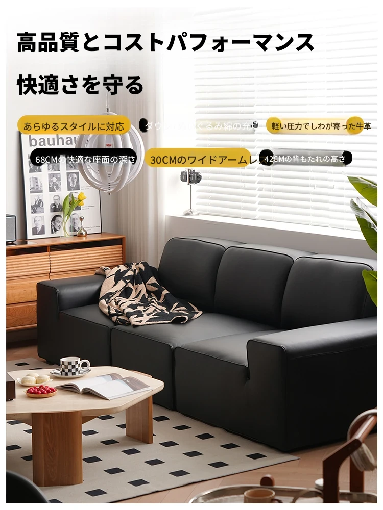 榆巷家具の大黒牛本革ソファ - 高品質な一級牛皮使用、北欧・和風デザインのコンパクトなリビング向けダウンソファ。おしゃれで快適な空間を演出します!