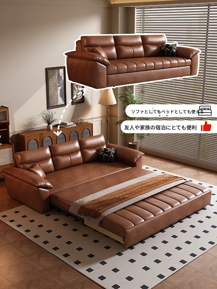 2025年新作!オイルワックスレザーキャラメルカラー多機能ソファベッド - レトロな魅力が漂うコンパクトサイズで、リビングにもぴったり!おしゃれで便利な二役をこなす、あなたの生活を豊かにするアイテムです。