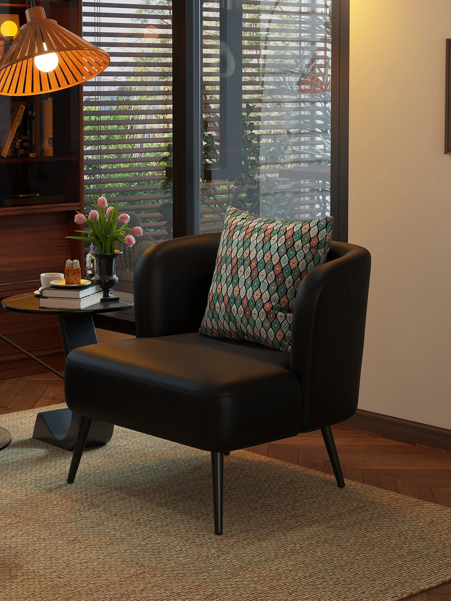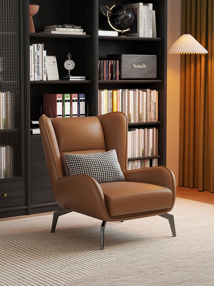 レトロな本革の一人用ソファチェア - デザイナーによる洗練されたデザイン、リビングルームや寝室、ホテルの受付に最適。快適な背もたれで、くつろぎのひとときを提供します。