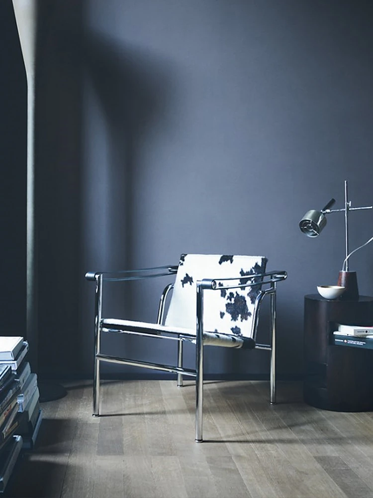 LC1バスキュランチェア シンプルでスタイリッシュなステンレススチール製リラックスチェア。コンパクトなリビングや小さなお部屋に最適な黒白の牛柄デザイン。背もたれが独特で、インテリアにアクセントを加えます。