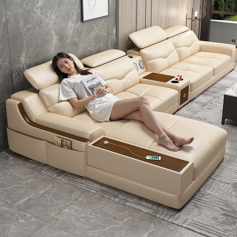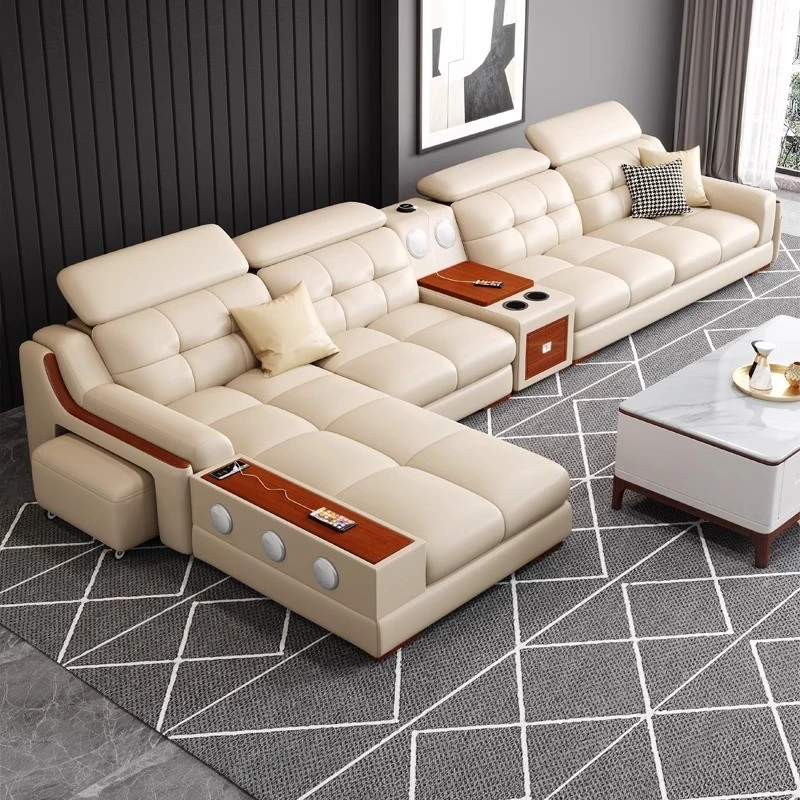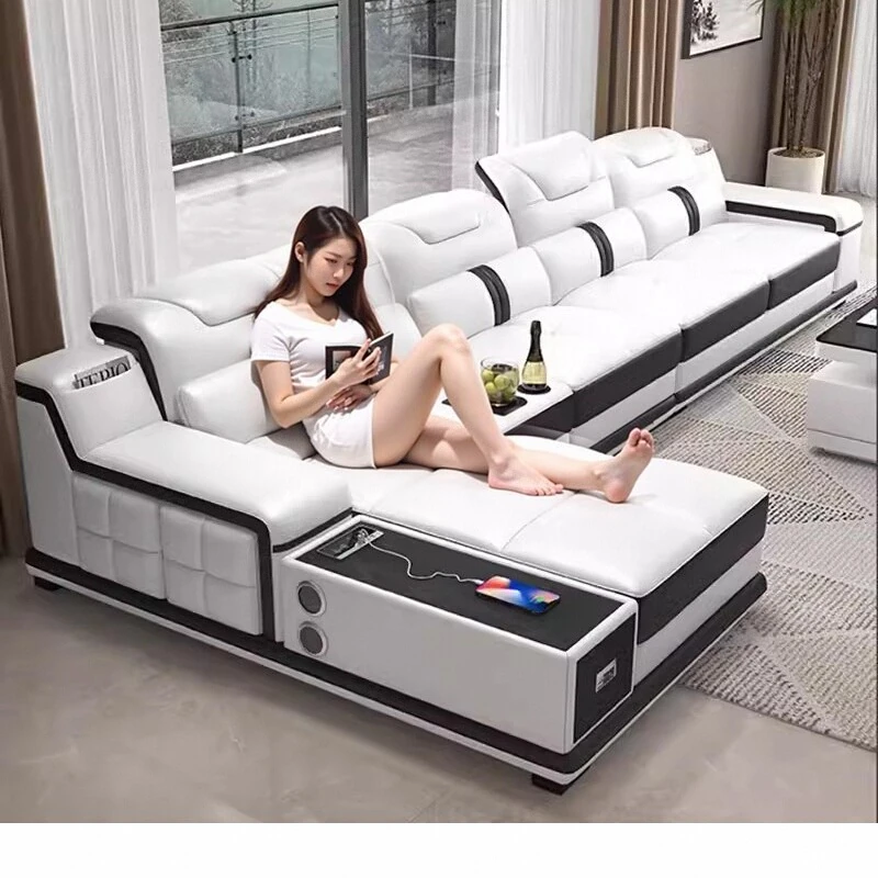 Modern Minimalist Genuine Leather Sofa with Bluetooth Speakers and Storage - Perfect for Any Living Room Size and Multifunctional Comfort