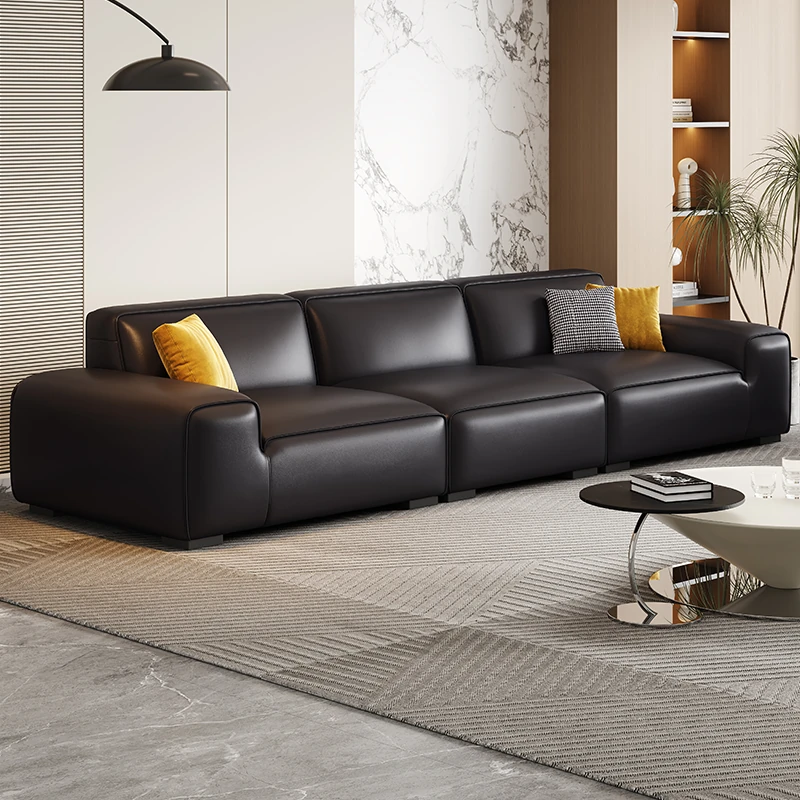 Stylish Black Genuine Leather Sofa for Living Room - Italian Minimalist Design, Top Layer Cowhide, 2025 Model, Perfect for Small Spaces, Contemporary Block Style