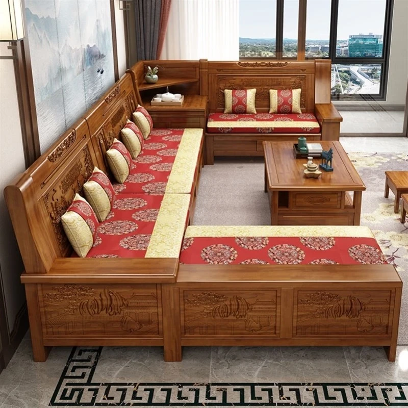 Modern Minimalist Chinese-Style Solid Wood Sofa - Zen-Inspired Corner Chaise Lounge 123 Combination Storage Sofa for Living Room