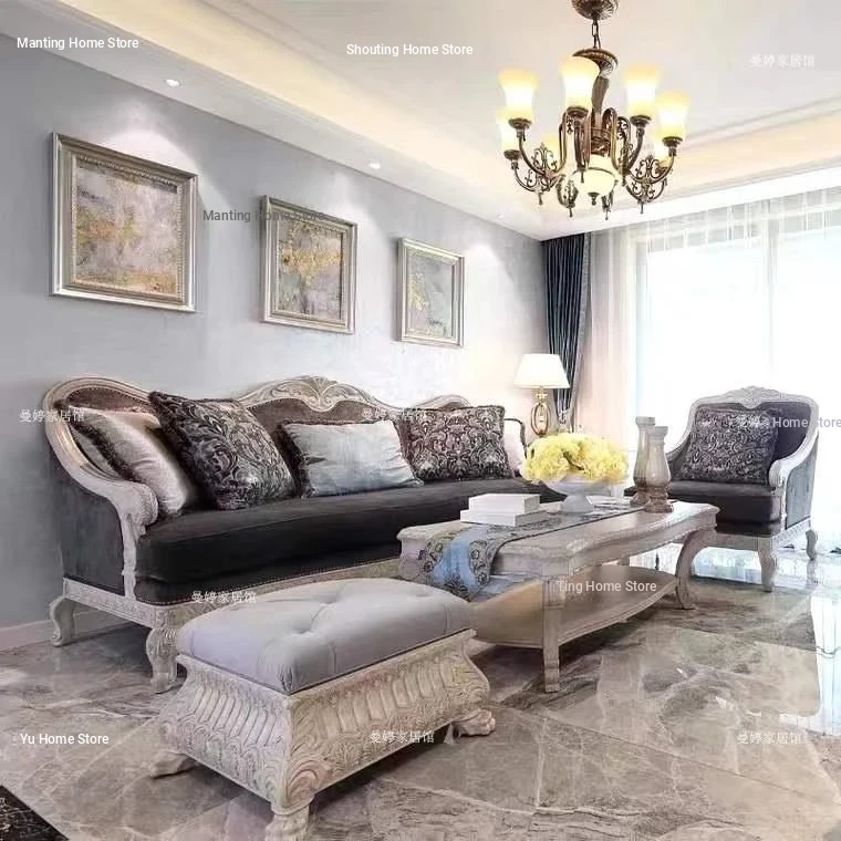 Elegant American-French Art Solid Wood Carved Sofa Set - Vintage Revival Style Three-Seater for Timeless Charm and Comfort