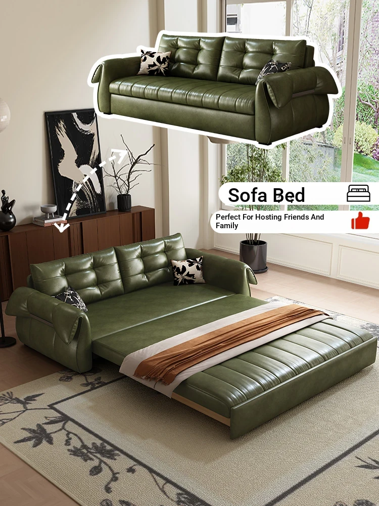 2025 New Vintage Green Waxed Leather Swan Sofa Bed with Storage - Versatile Foldable Double Sofa for Living Room