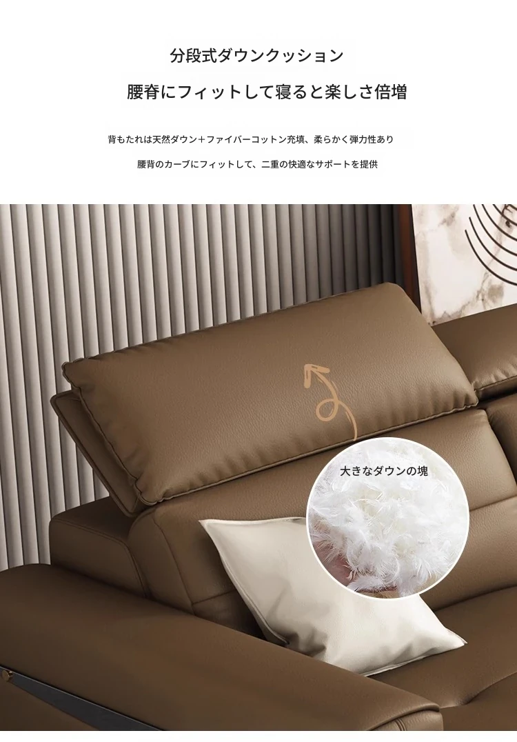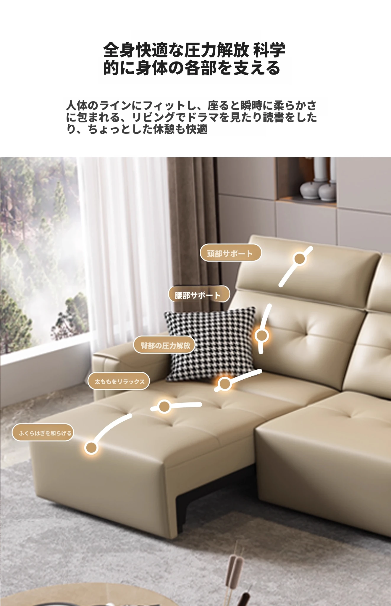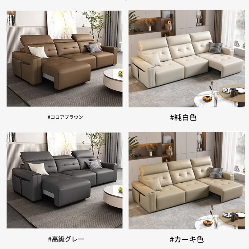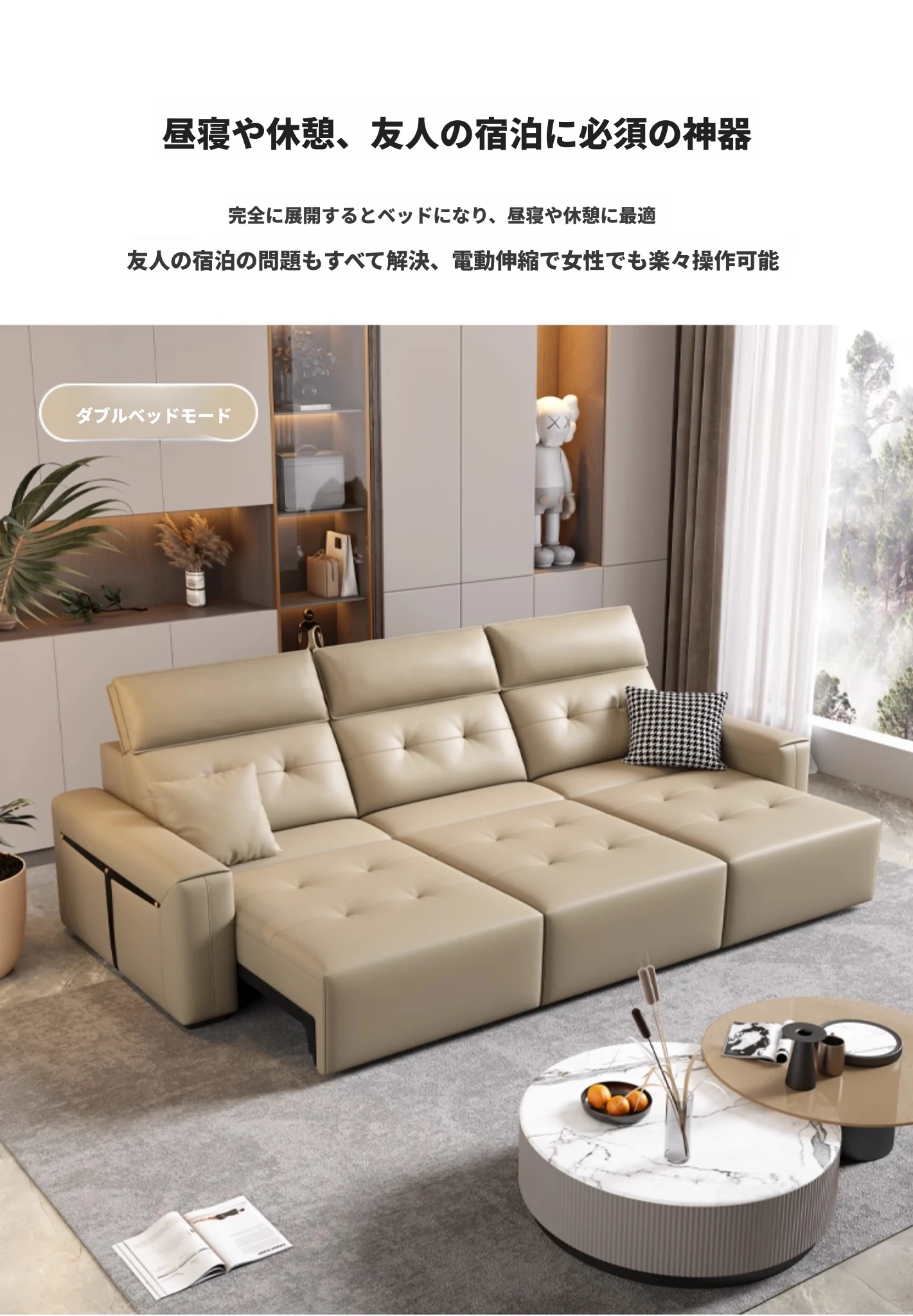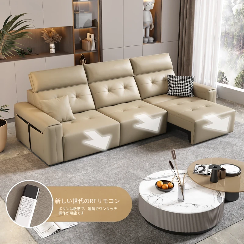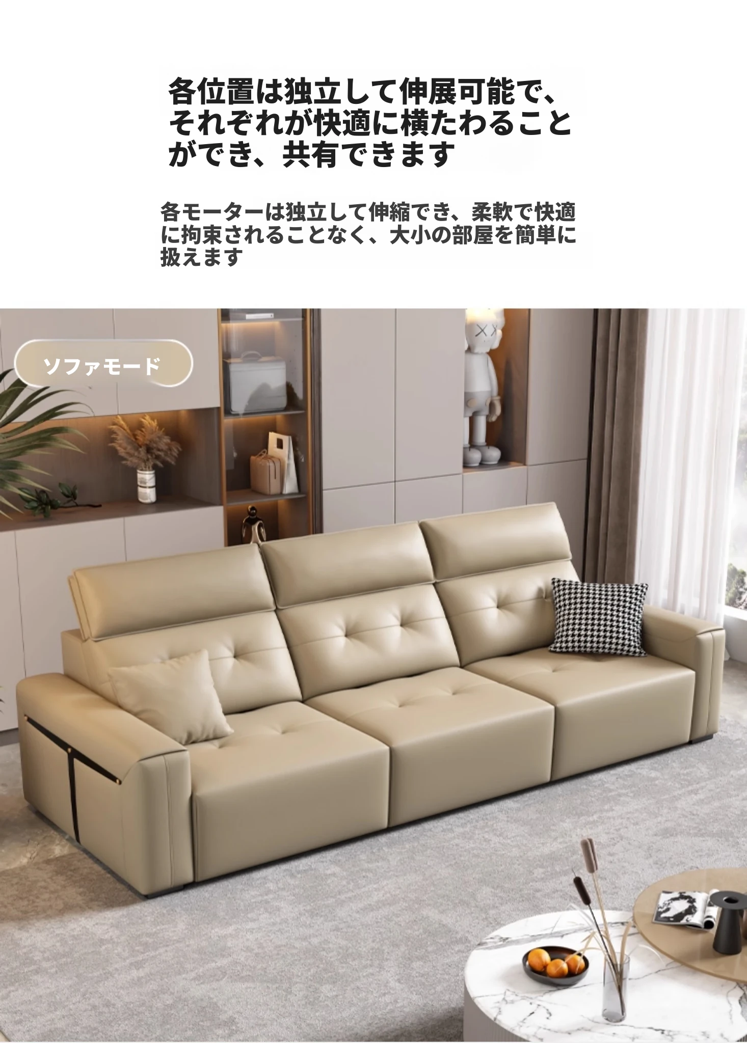 リビングに最適!機能性電動本革ソファベッド - スライド式・調整可能なヘッドレスト付き、最高級の牛革使用で家庭映画館体験を実現!快適さとスタイルを兼ね備えたソファです。