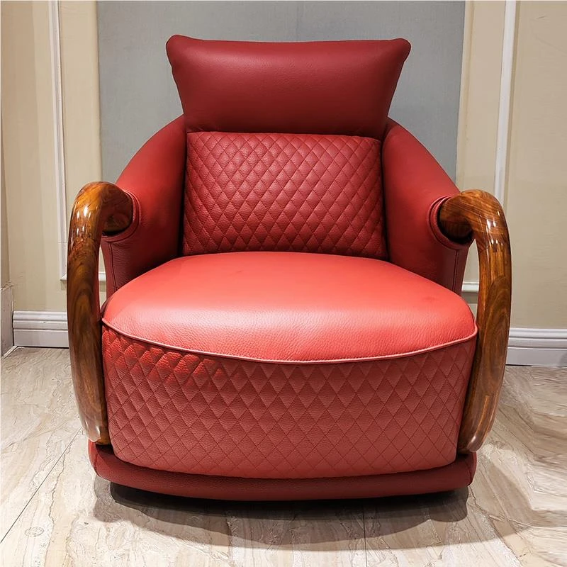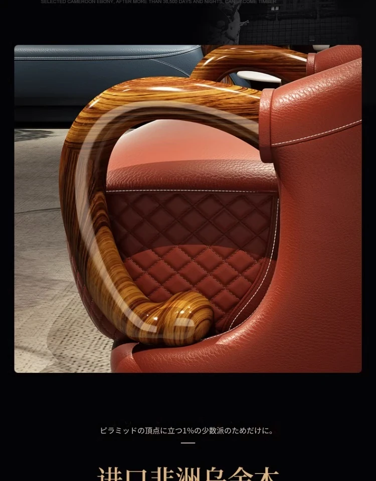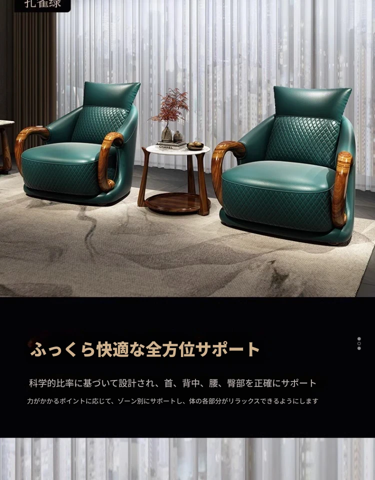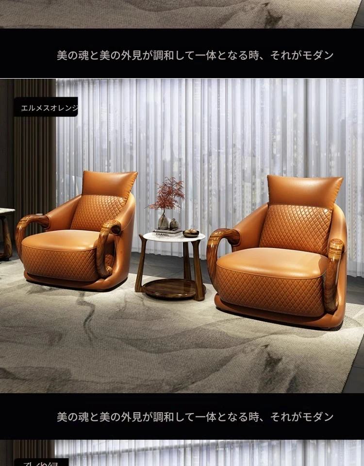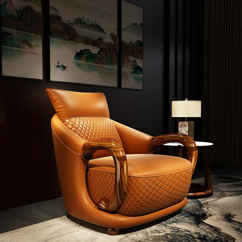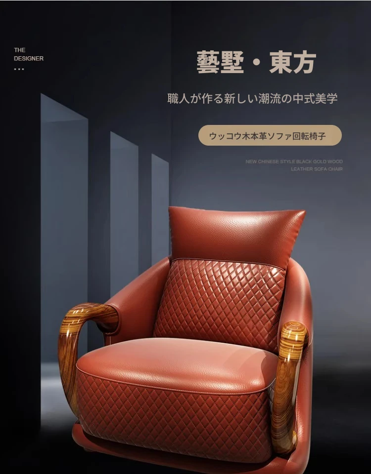 ウッド真新中式リラックスチェア - 高級感あふれる無垢材と皮革のコンビネーション、デザイナーによる洗練された一人掛けチェア。4本の高背設計で、虎のような存在感を放ちます。あなたの空間に上質なスタイルを!