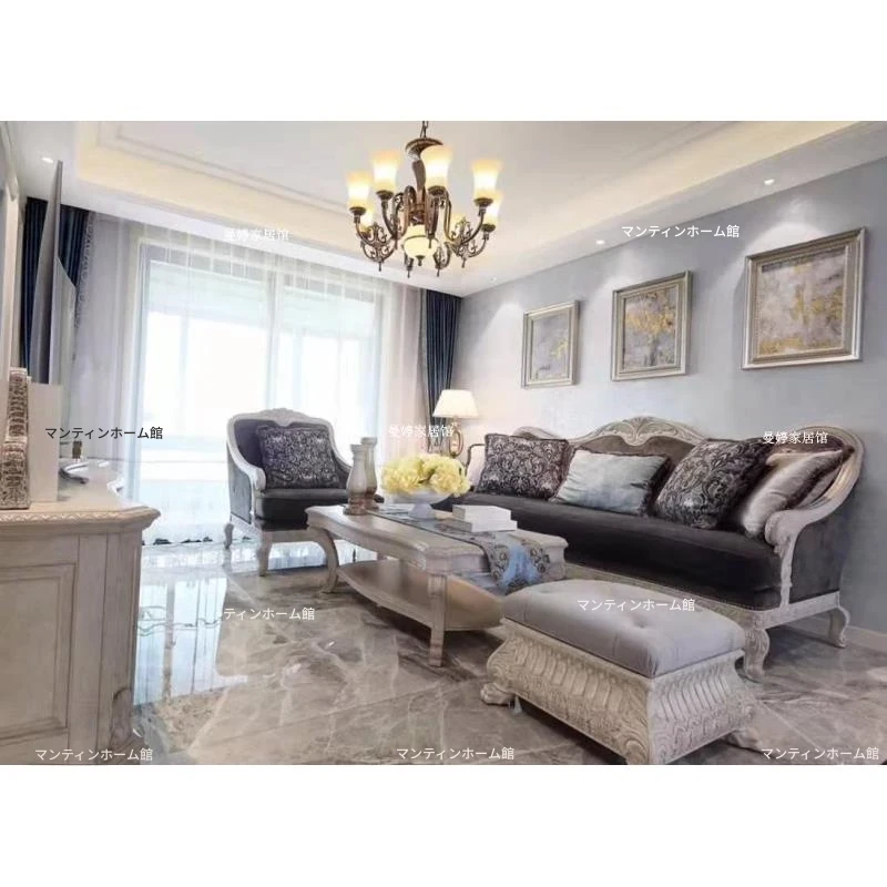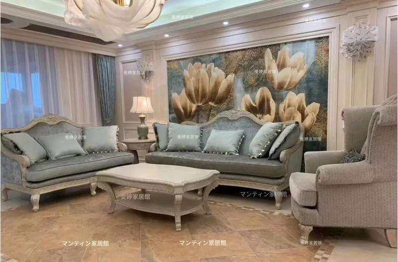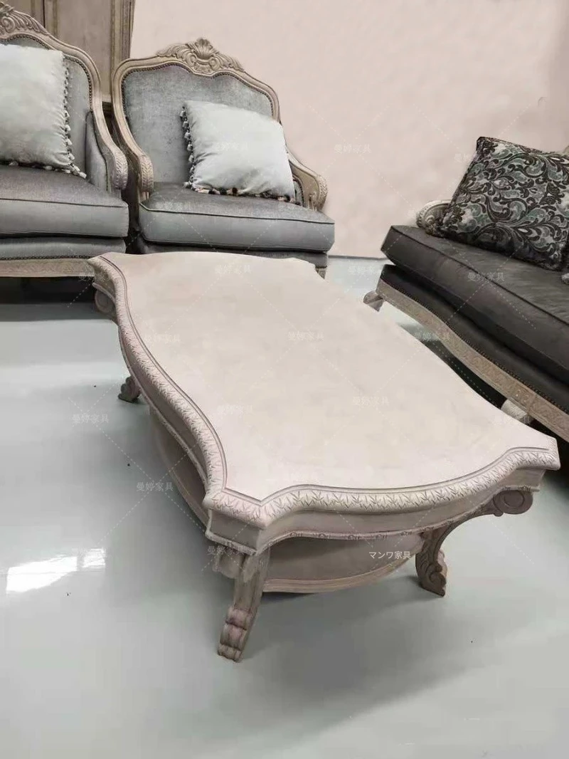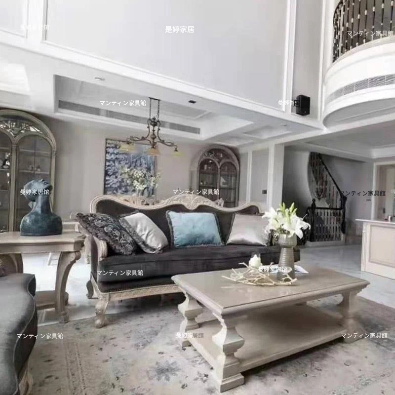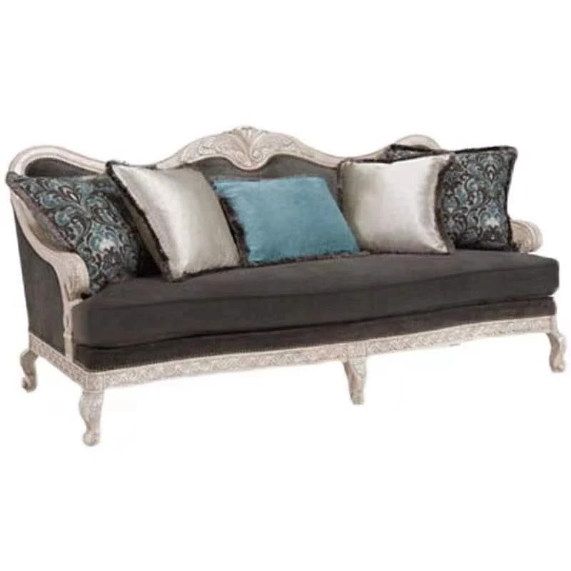 美しいアメリカン・フレンチスタイルのアート彫刻ソファ - 高級天然木製、復興の印象を与えるヴィンテージ風三人掛けソファセット。お部屋に優雅さと温かみをプラス!