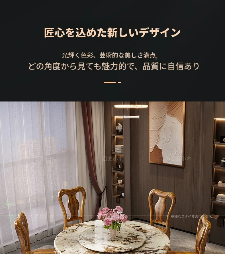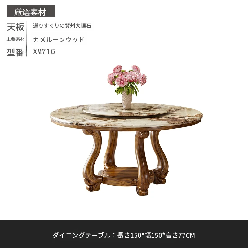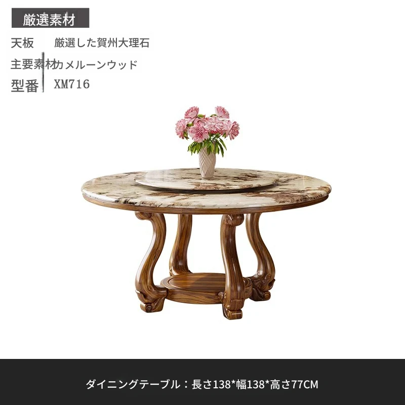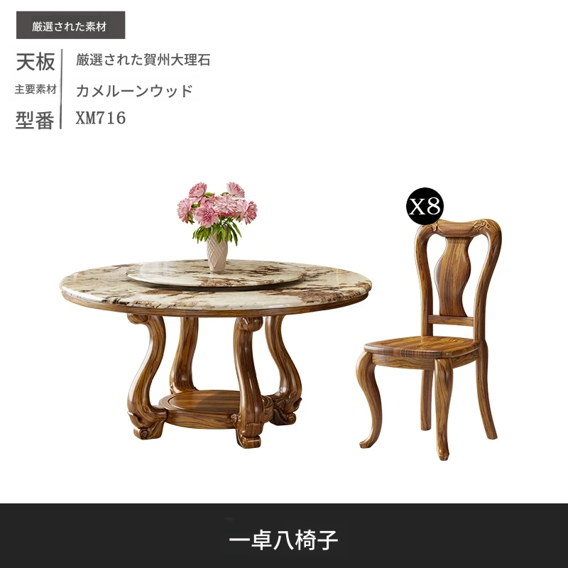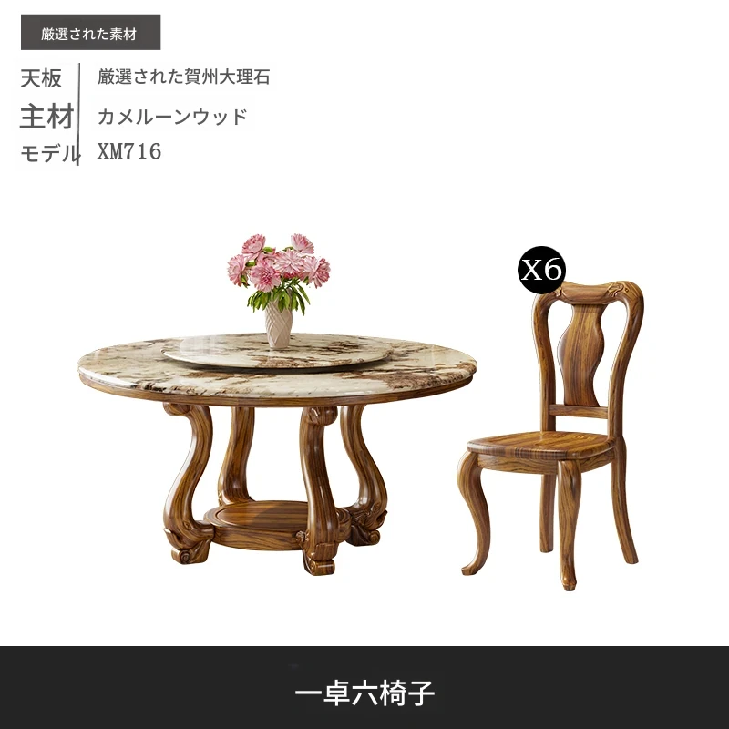 ウッディなウーキン木製ラウンドダイニングテーブル&チェアセット - 新中式スタイル、豪華な大理石天板、回転式プレート付き、頑丈な無垢材で作られた家族向けのダイニングテーブル!