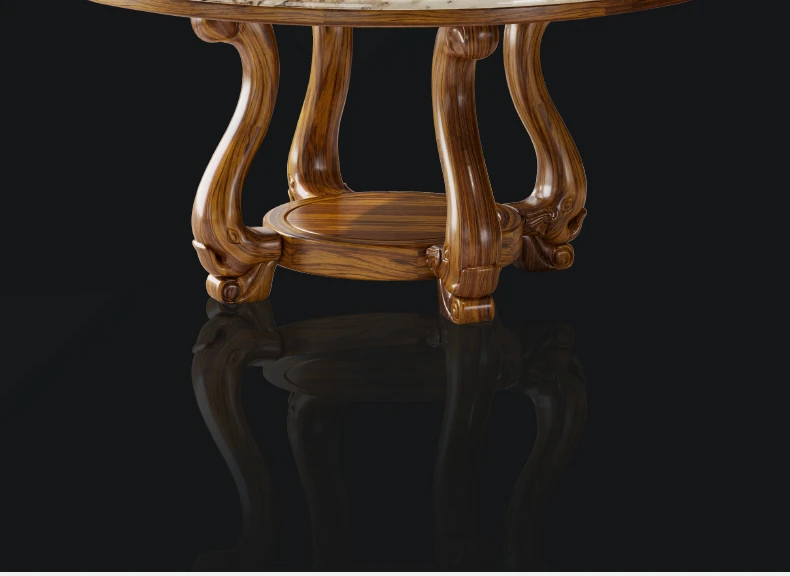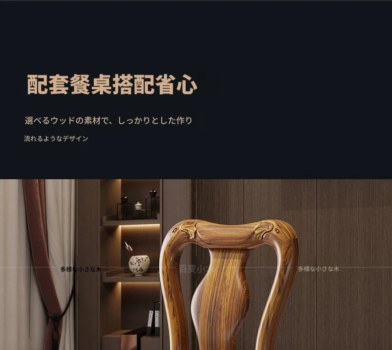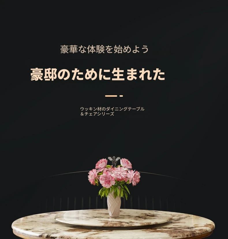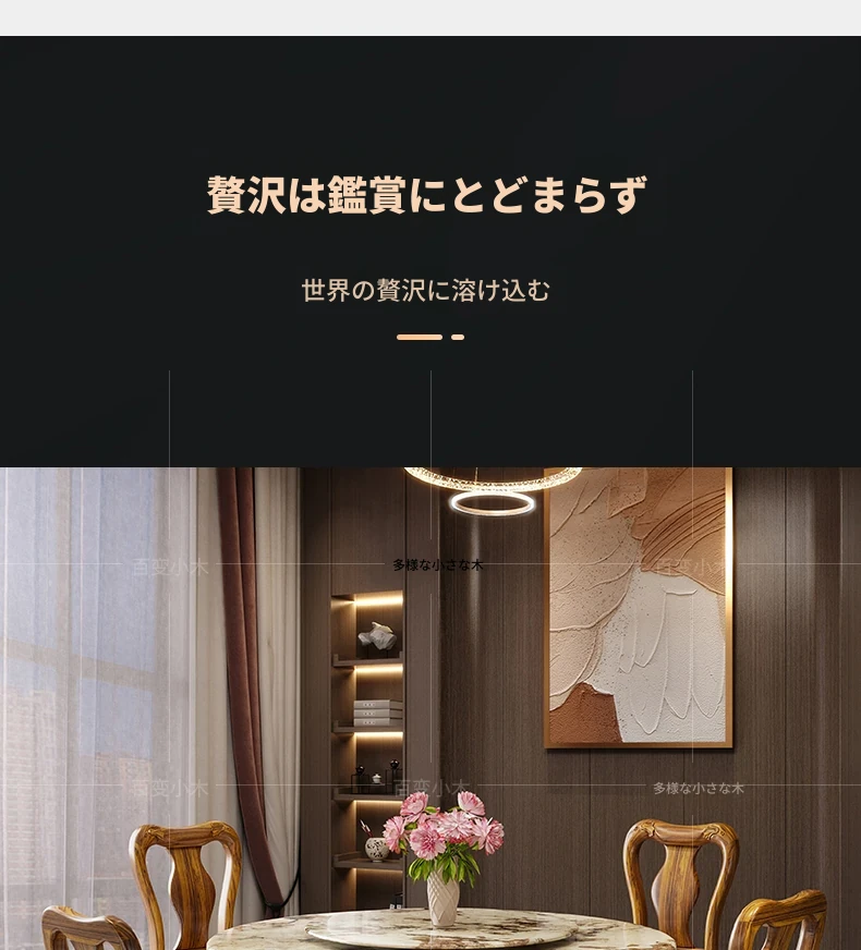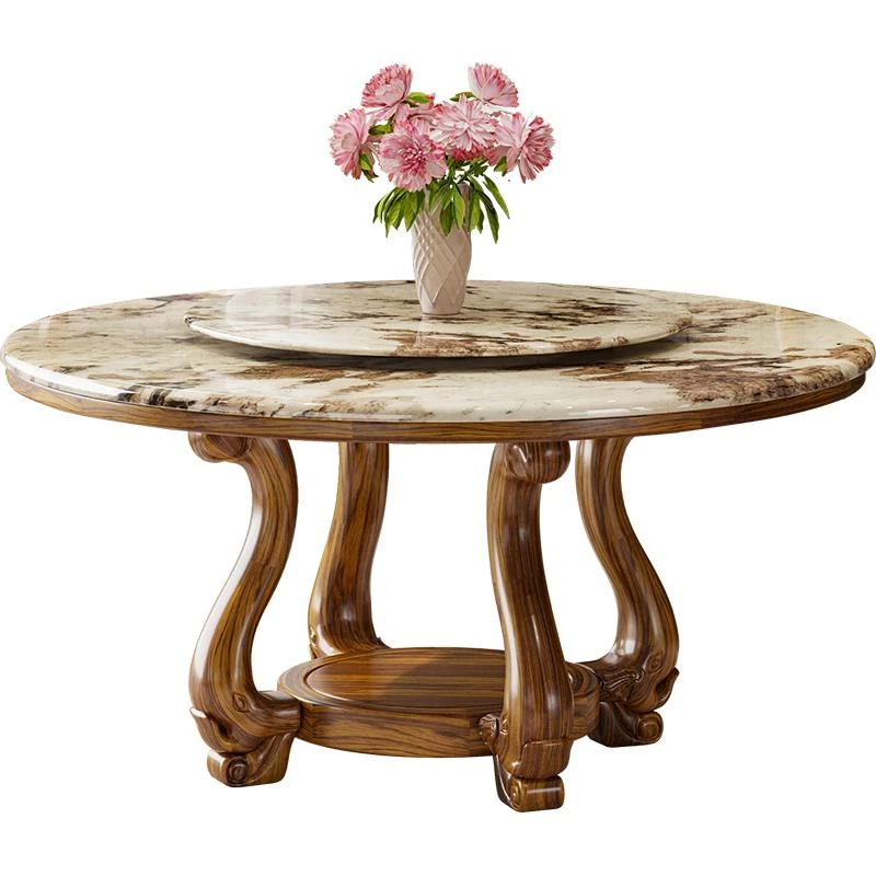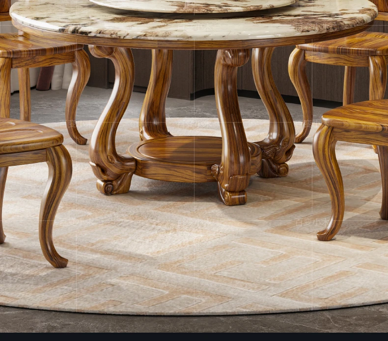 ウッディなウーキン木製ラウンドダイニングテーブル&チェアセット - 新中式スタイル、豪華な大理石天板、回転式プレート付き、頑丈な無垢材で作られた家族向けのダイニングテーブル!