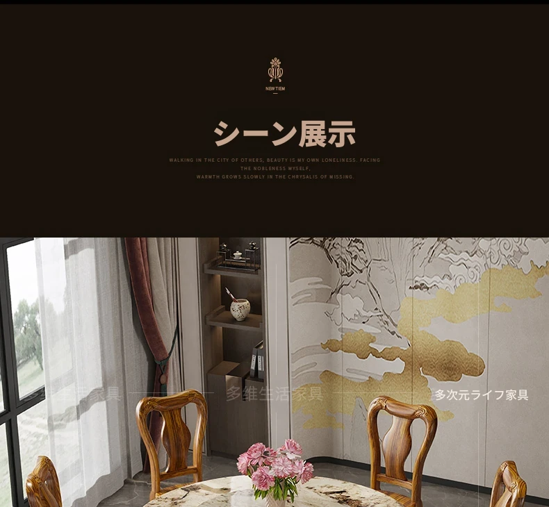 ウーキンウッド大理石ダイニングテーブル 新中式 高級ヴィラ向け 大型円形ダイニングテーブル 回転式天板付き 天然木製 椅子セットで贅沢な食卓を演出!
