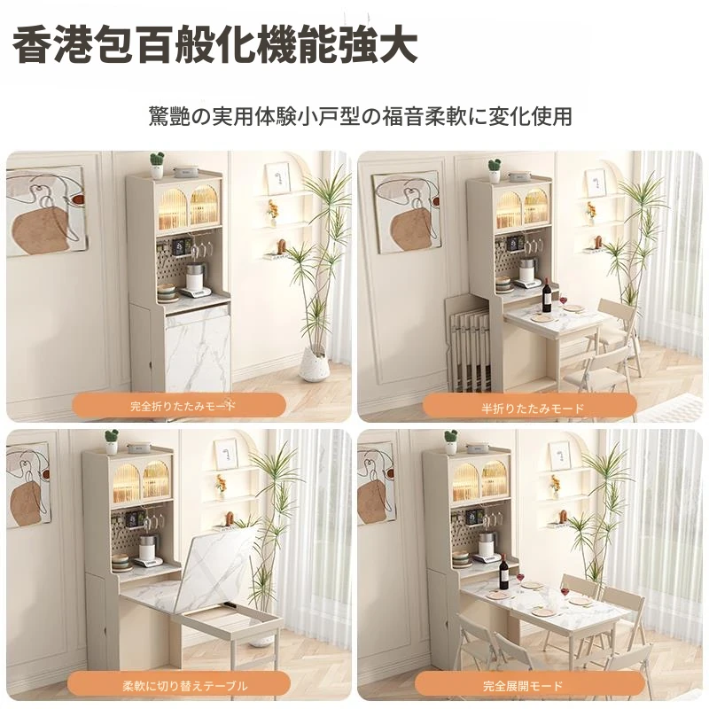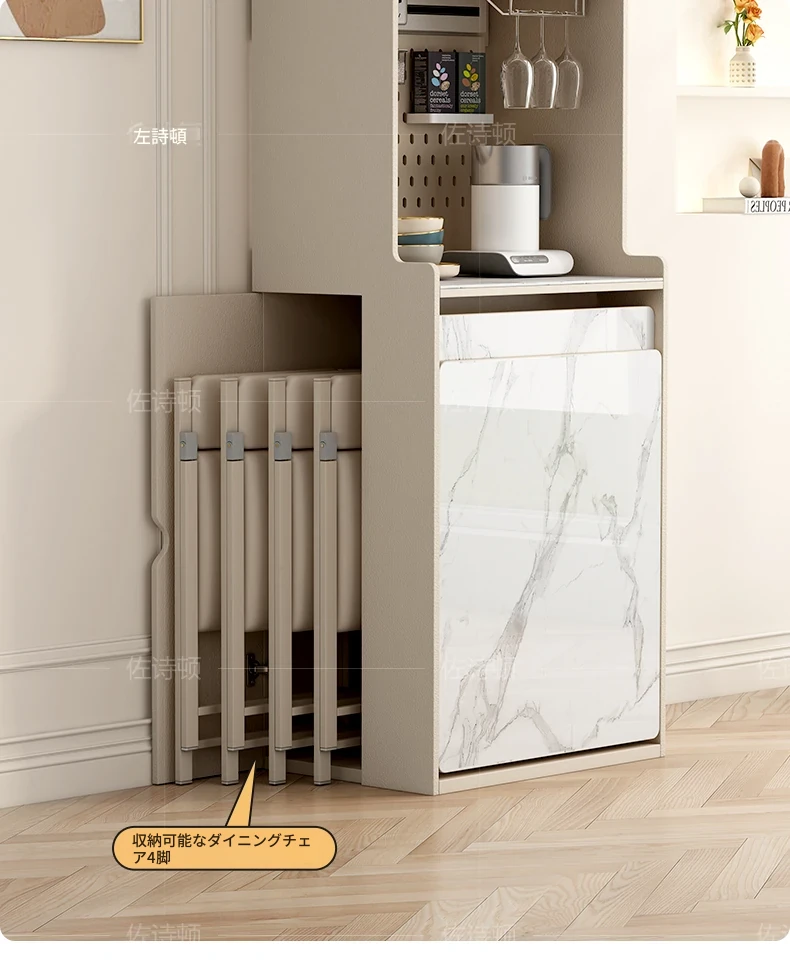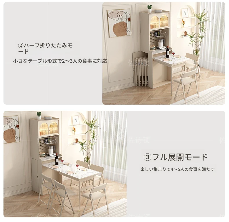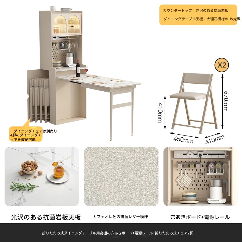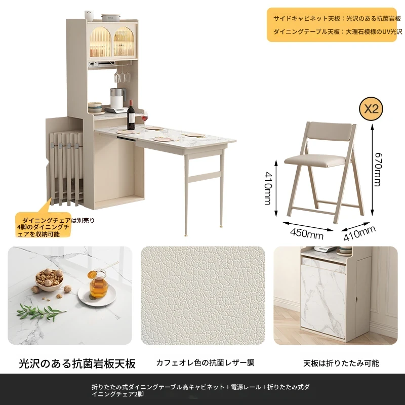 ダイニングテーブルとサイドキャビネット一体型+折りたたみ式ダイニングチェア*2