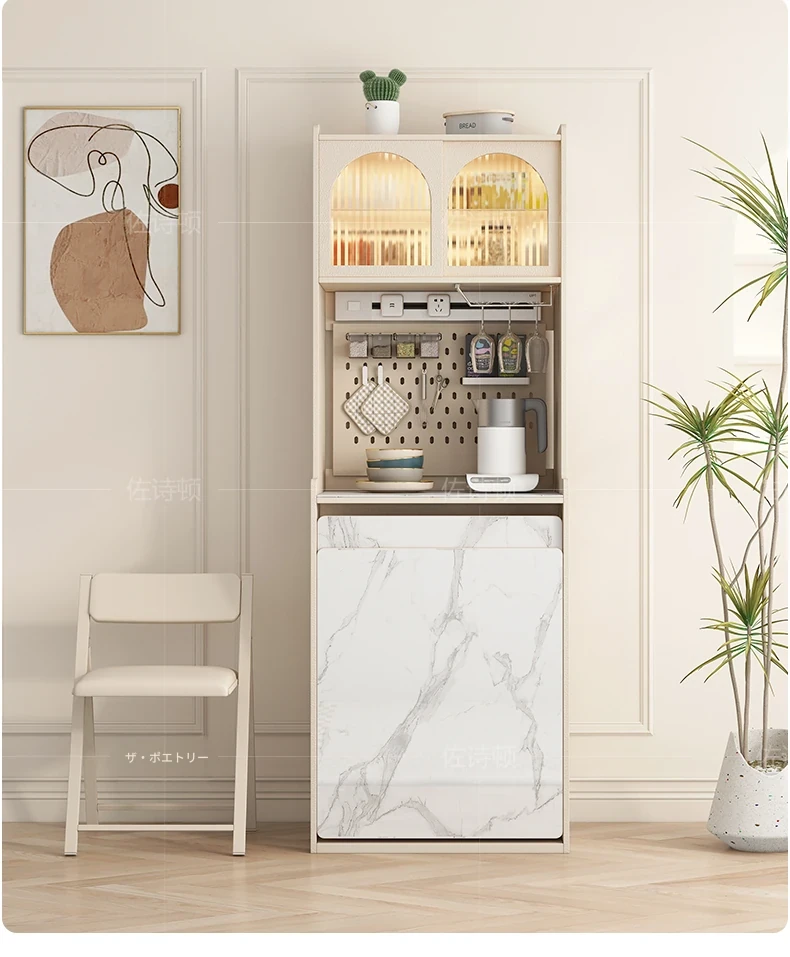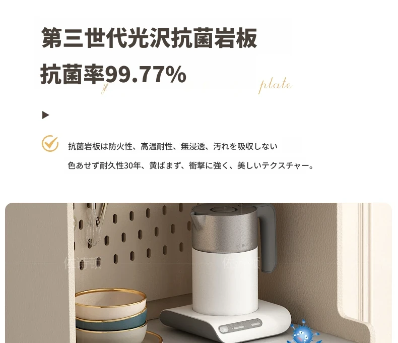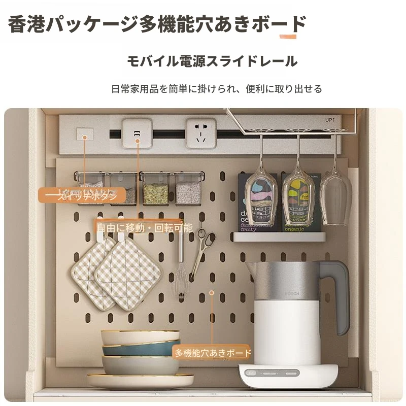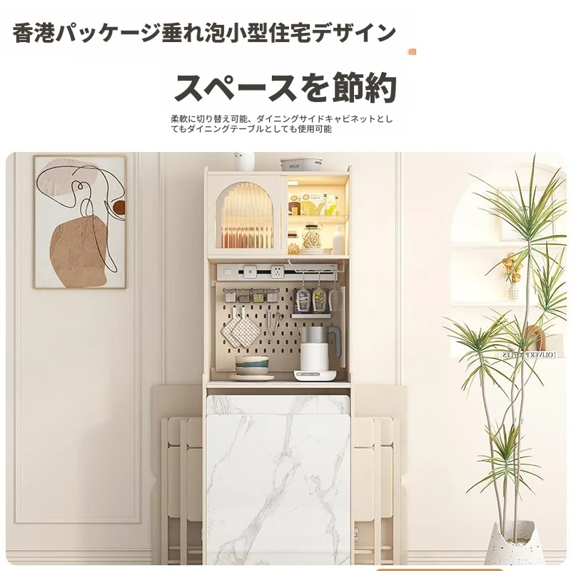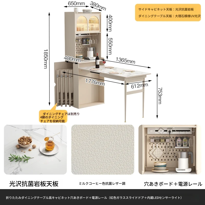 ダイニングテーブルとサイドキャビネット一体型+ボード+移動式電源タップ+折りたたみ式ダイニングチェア*2