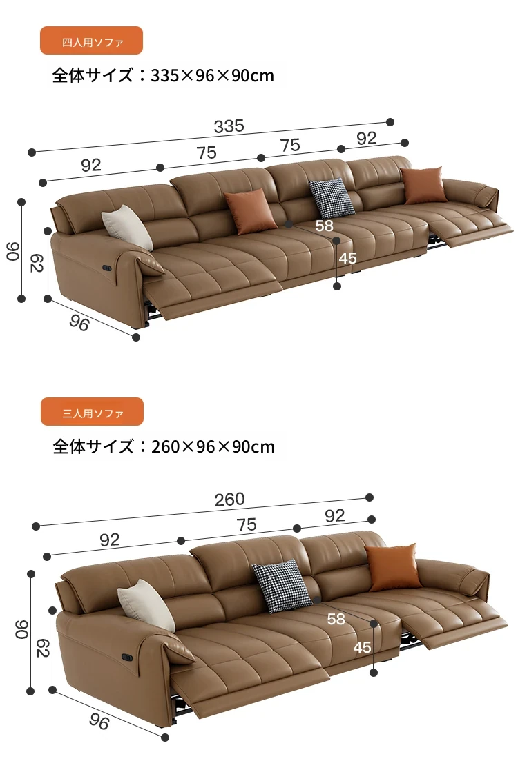 【一層牛革:ダブル電動機能付き】2.6メートルトリプルソファ
