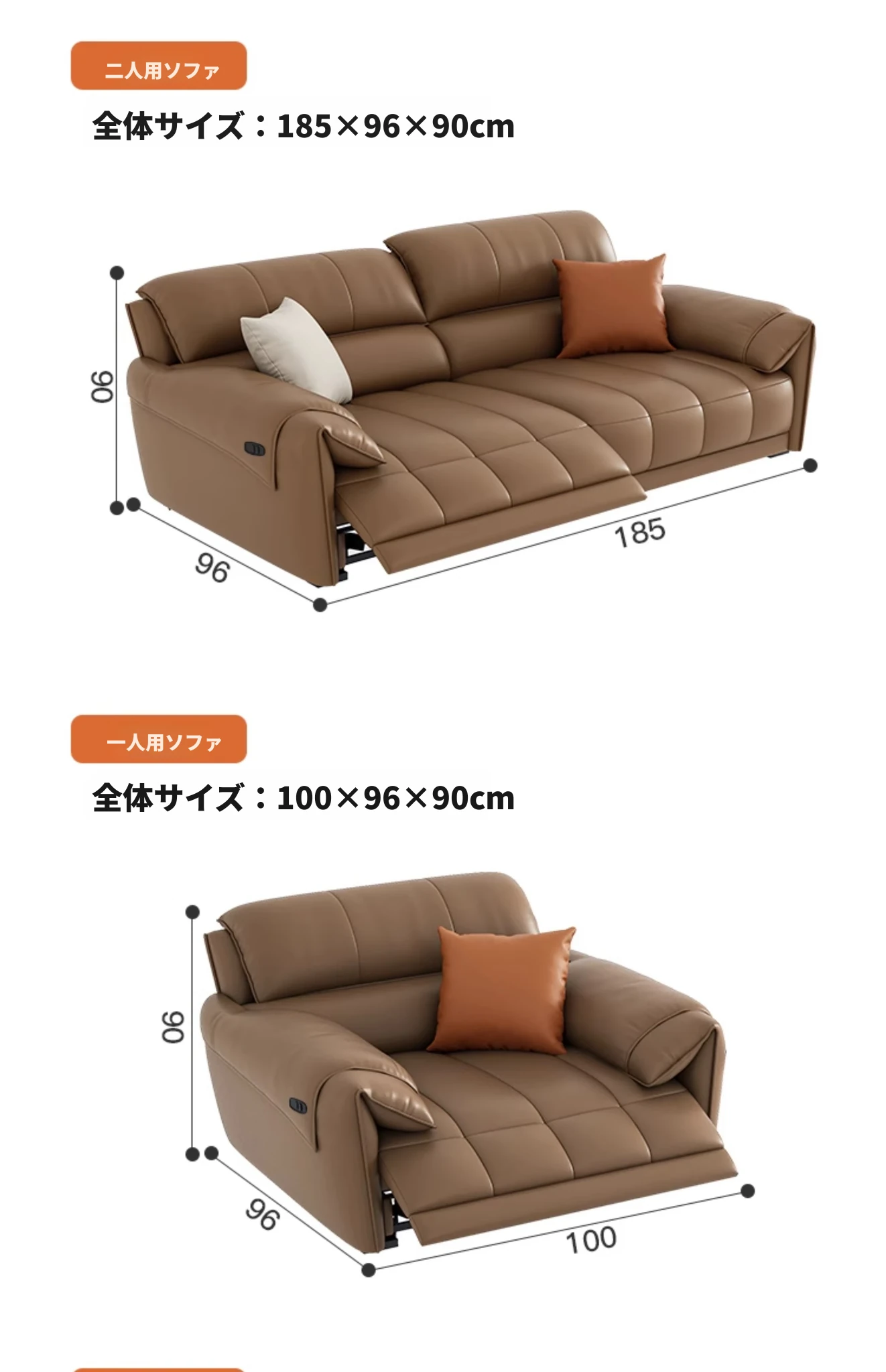 【一層牛革:シングル電動機能付き】1.85メートルダブルソファ