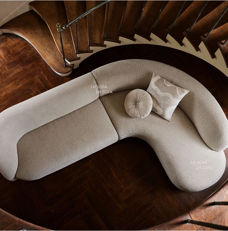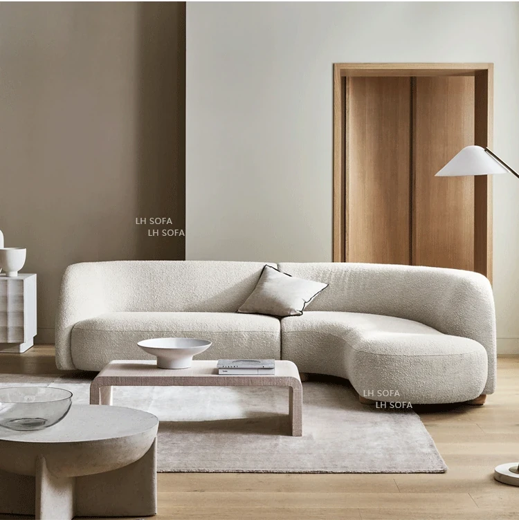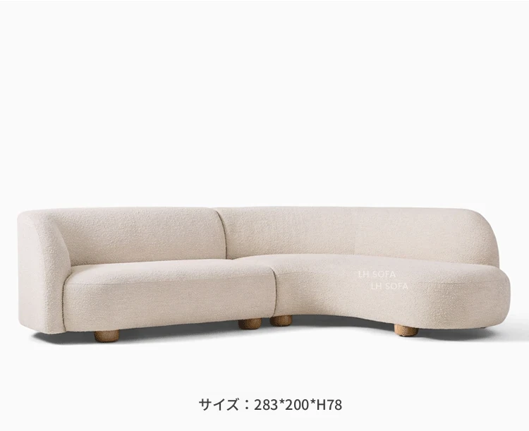ミニマルな侘び寂びスタイルのラムシアフロソファー - 北欧のラグジュアリーなデザイン!曲線美が魅力のコーナーハウスソファー、スタジオにぴったりな家具です。