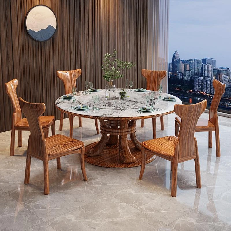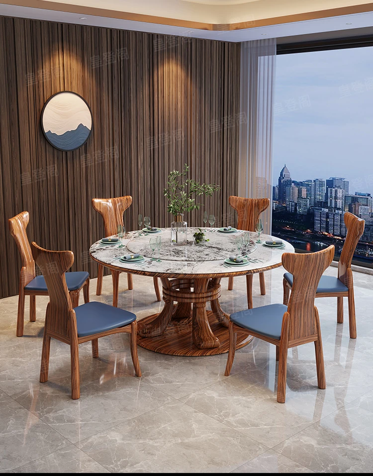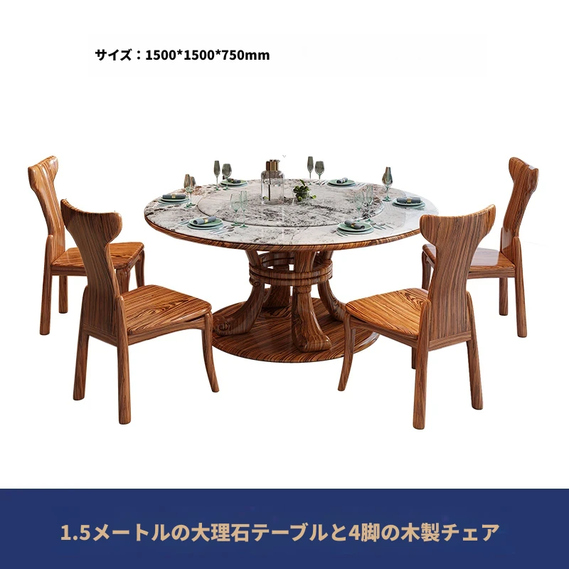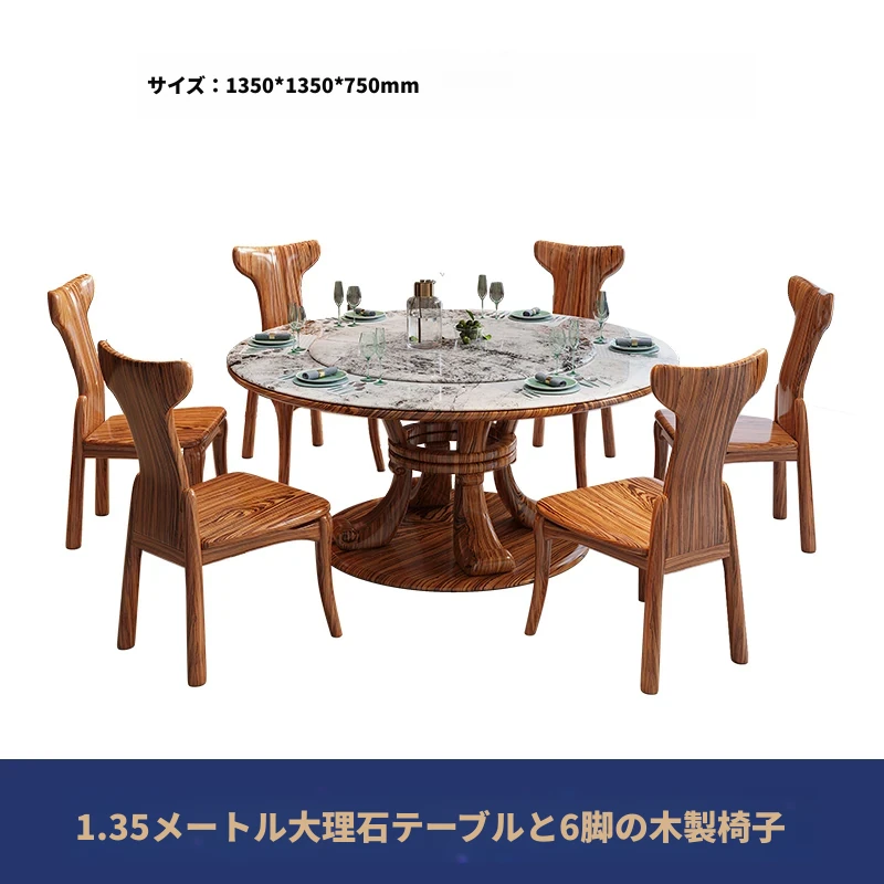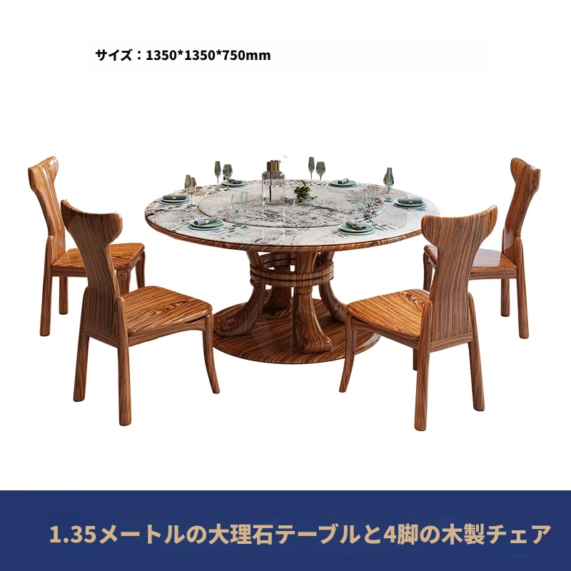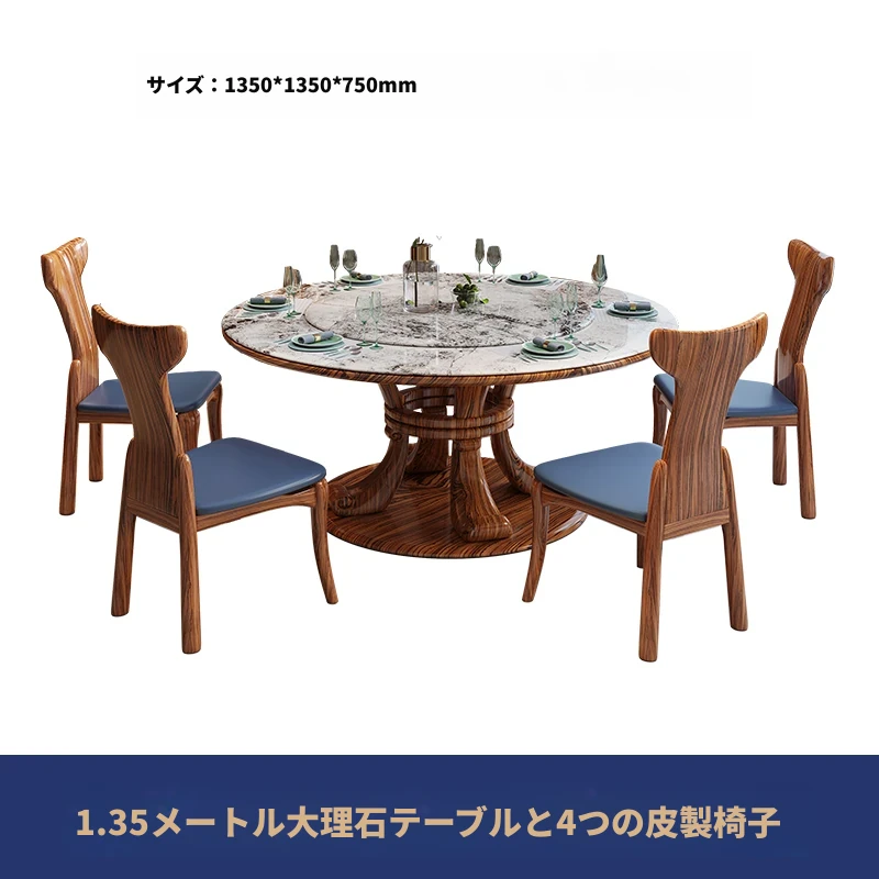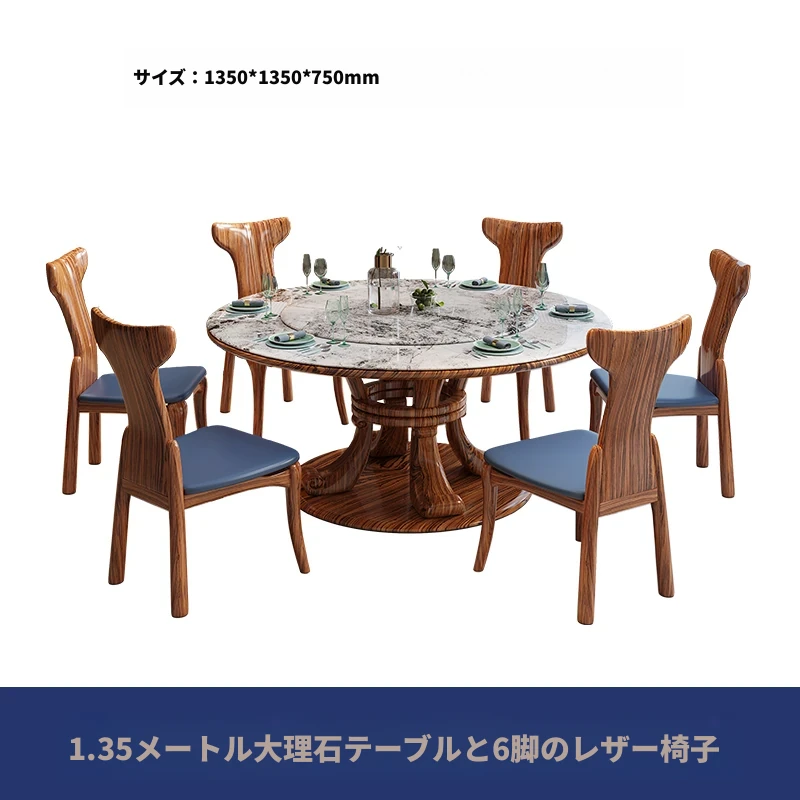 新中式ウッ金材質の大理石円形ダイニングテーブル&チェアセット - 現代的で豪華な別荘リビングに最適な天然木製の食卓!