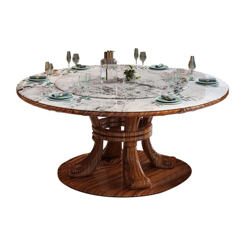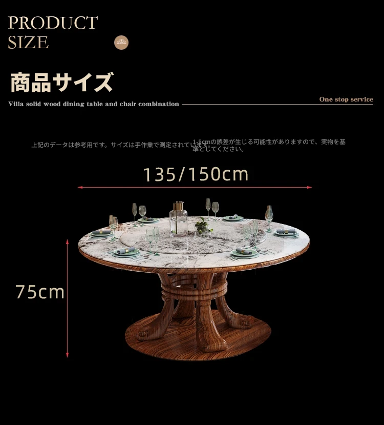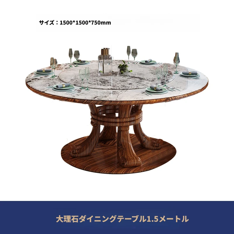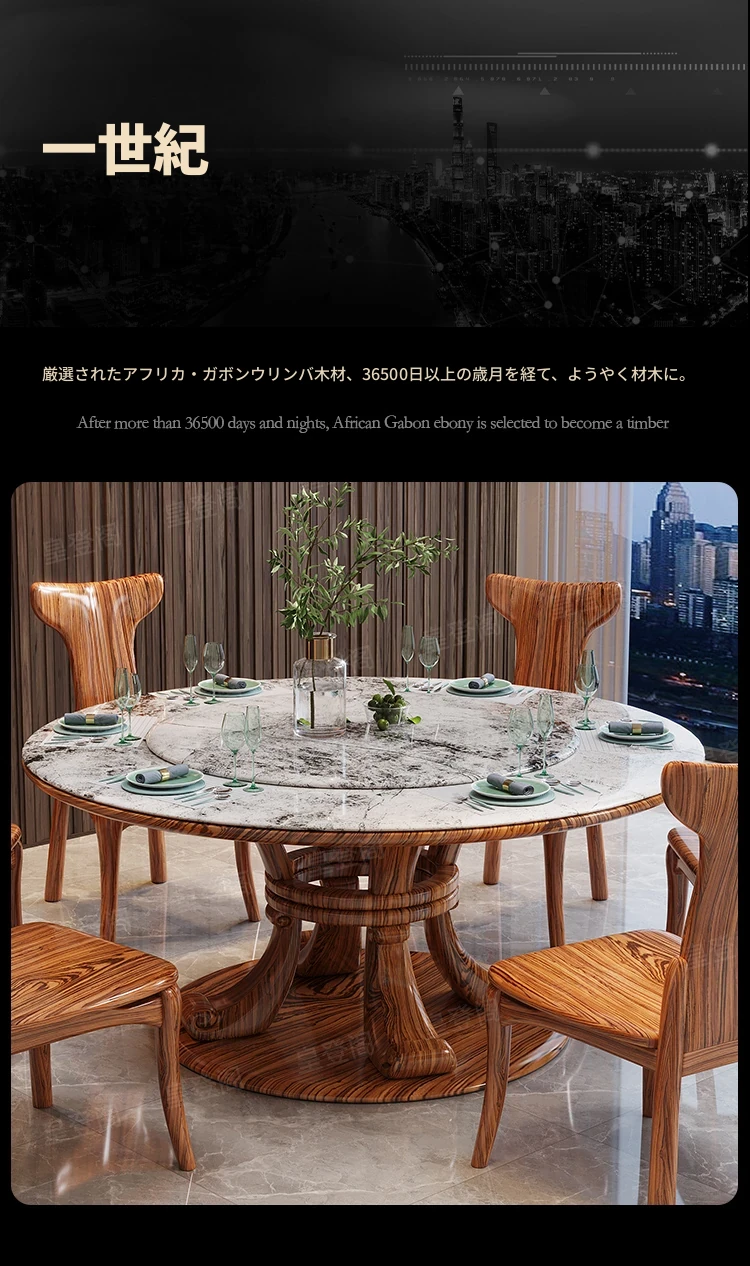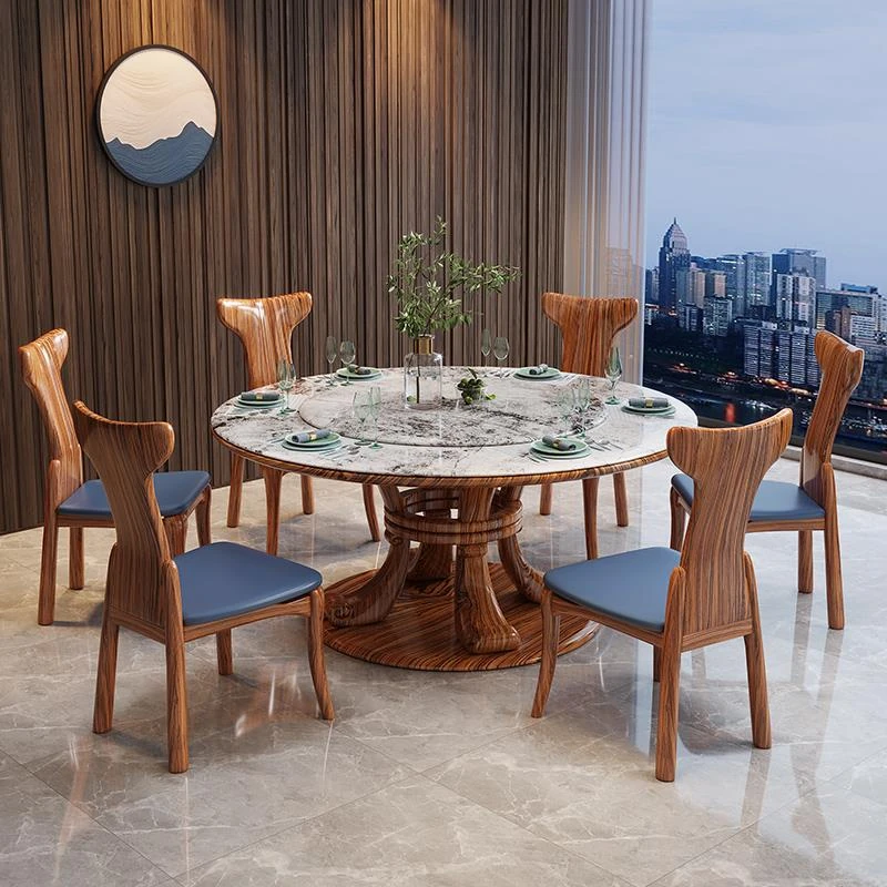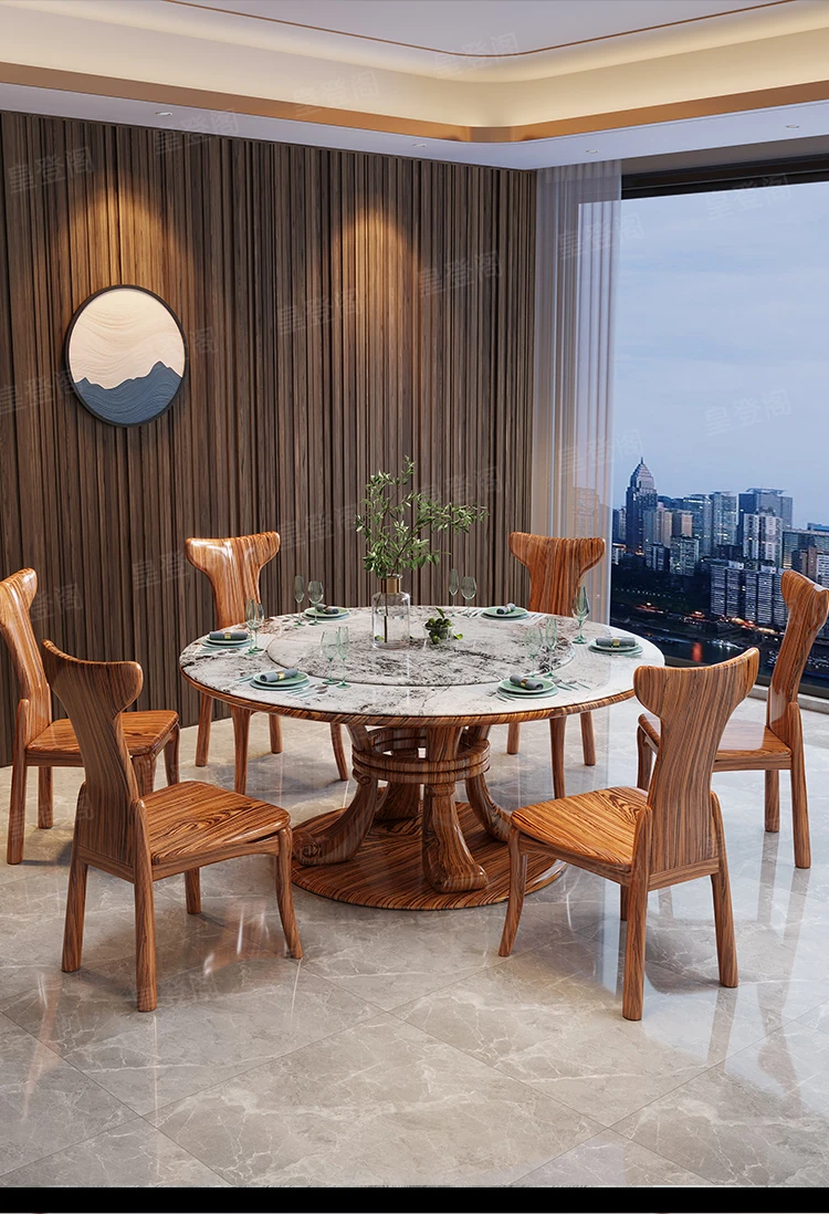 新中式ウッ金材質の大理石円形ダイニングテーブル&チェアセット - 現代的で豪華な別荘リビングに最適な天然木製の食卓!