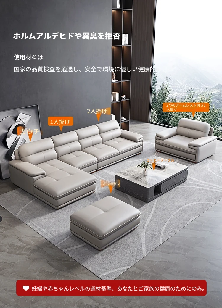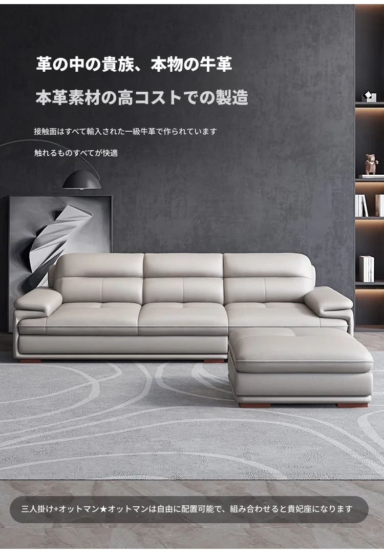 3人掛け+ダブルアームシングル+オットマン【輸入牛革】