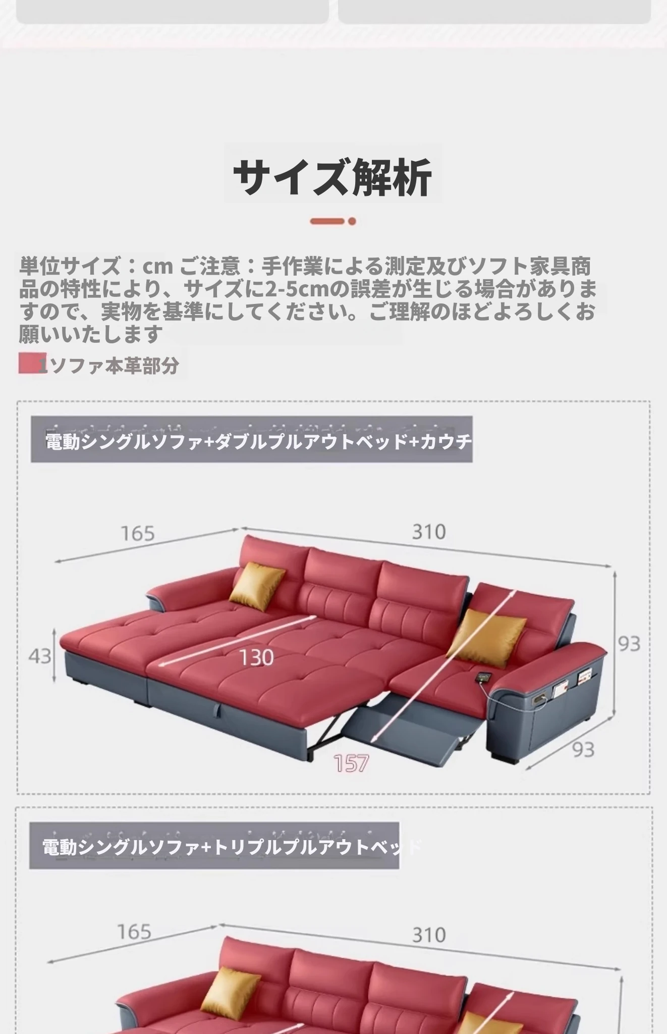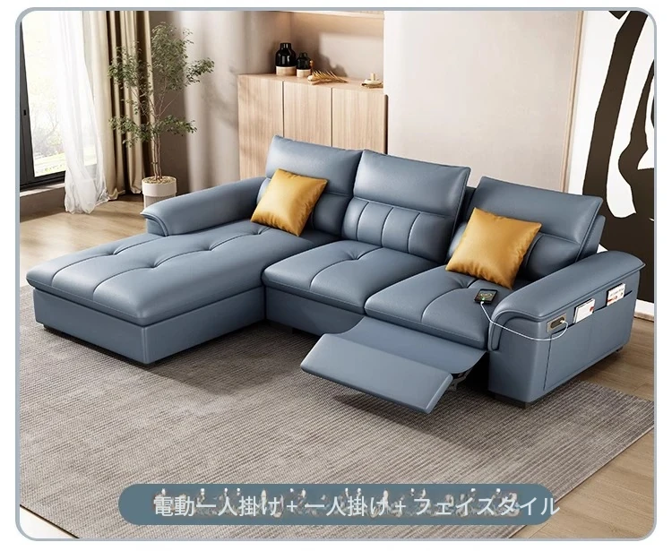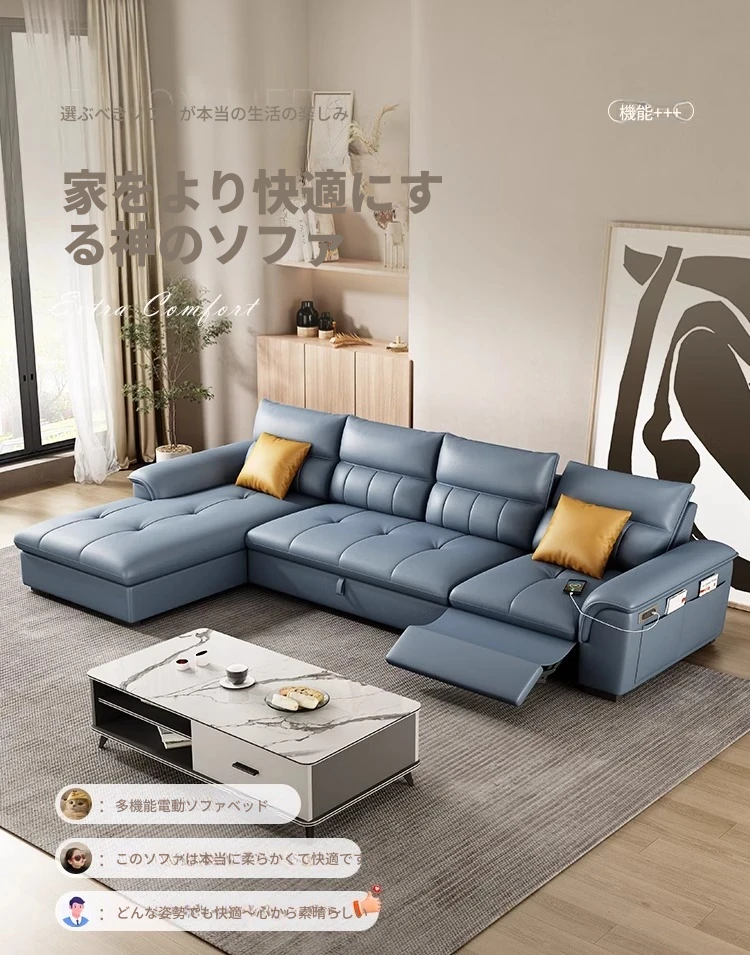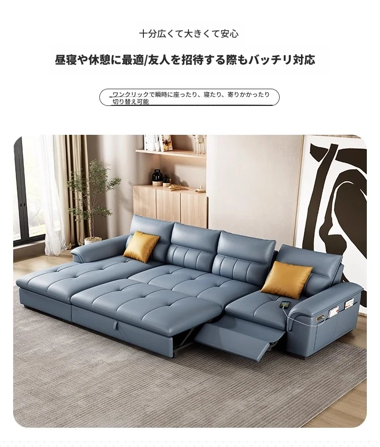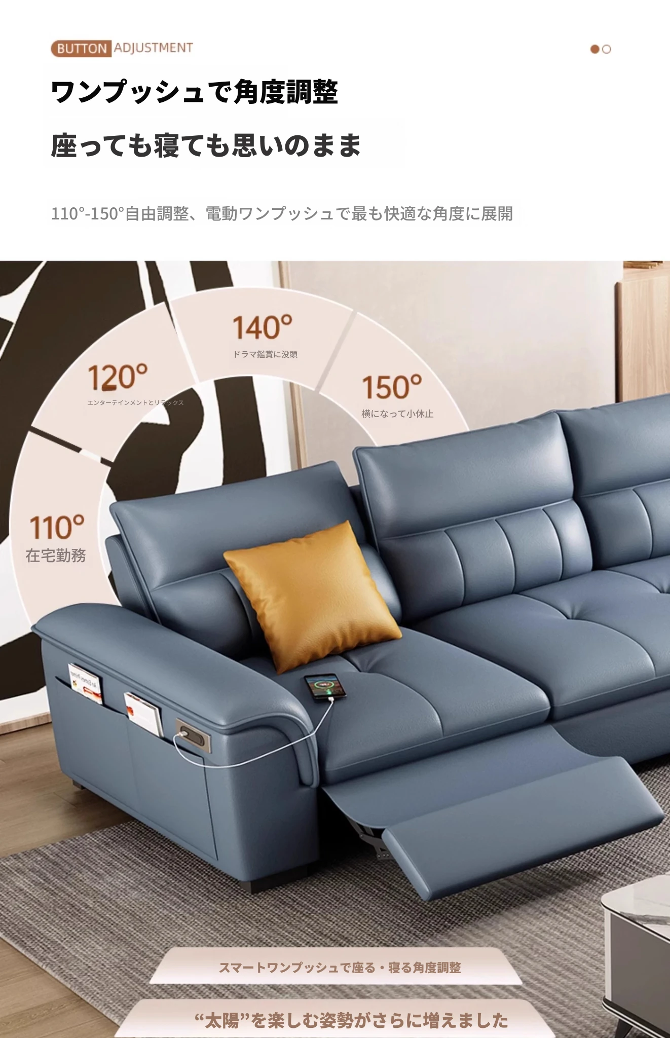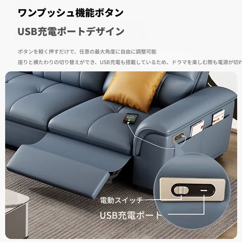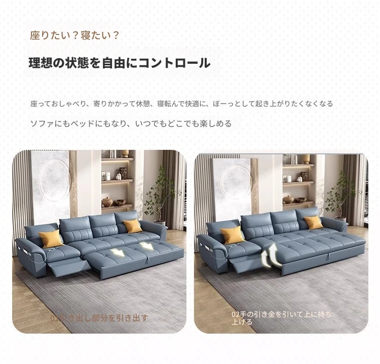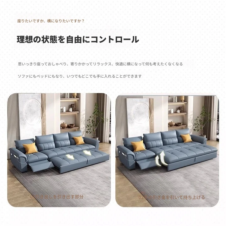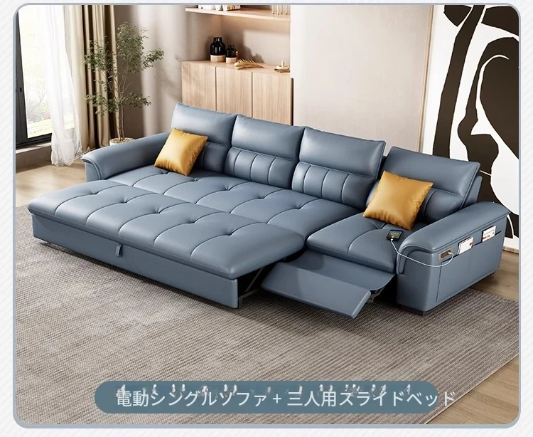 壁に寄り添う高級本革電動多機能ソファベッド - モダン&シンプルデザイン、折りたたみ収納機能付きでお部屋をスッキリ!リビングに最適な2WAYソファです。