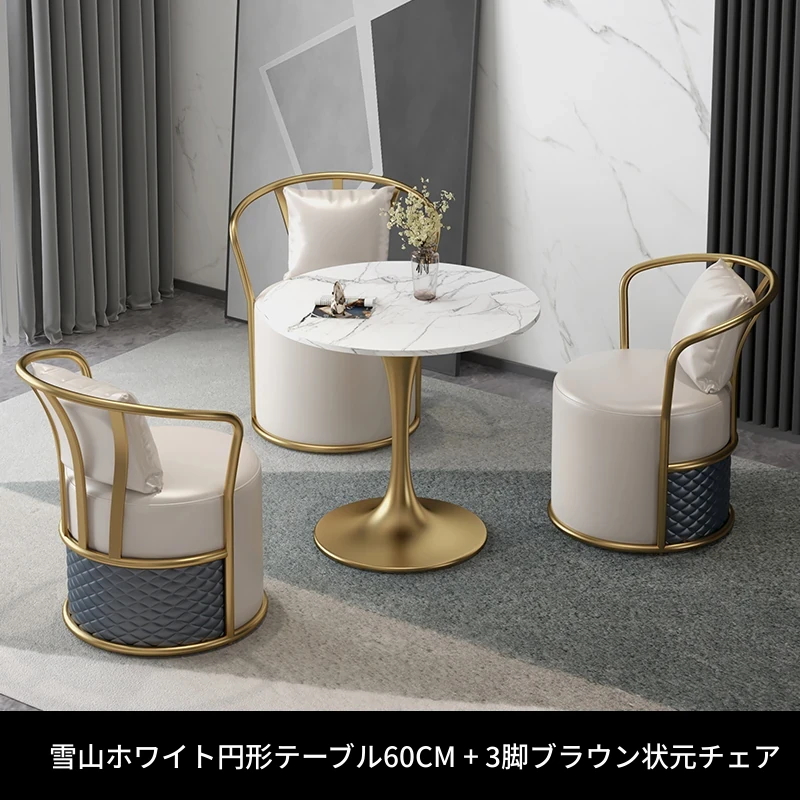 60雪山白の丸テーブル+3脚のコーヒー色の状元椅 【在庫あり】