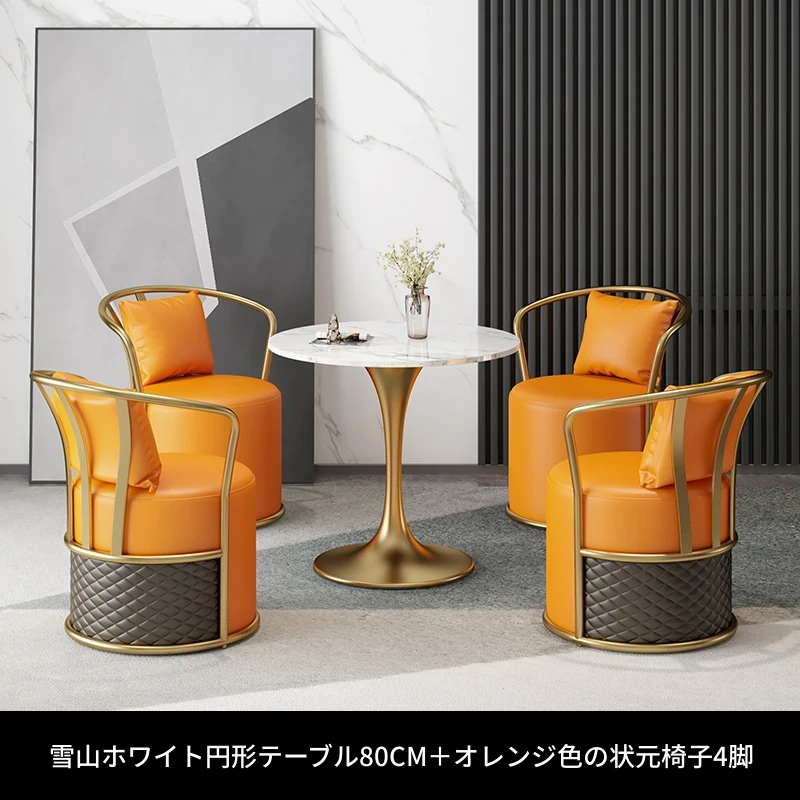 80雪山白の丸テーブル+4脚のオレンジの状元椅 【在庫あり】
