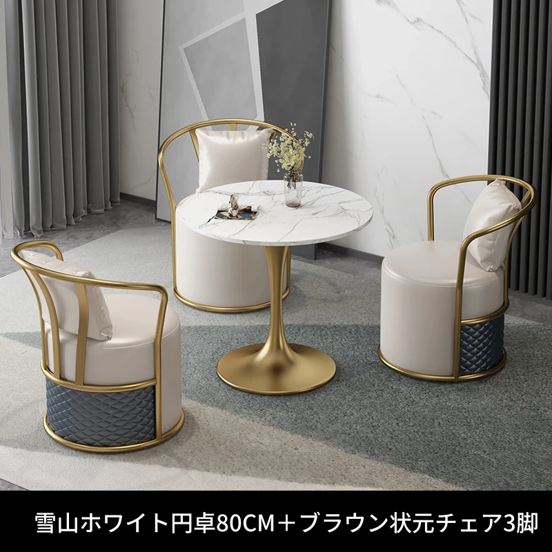 80雪山白の丸テーブル+3脚のコーヒー色の状元椅 【在庫あり】