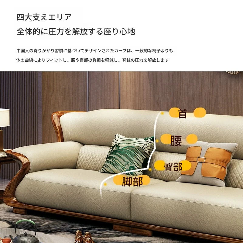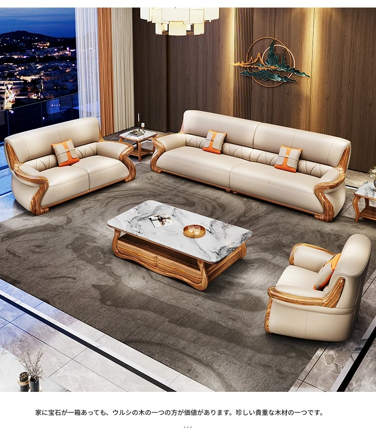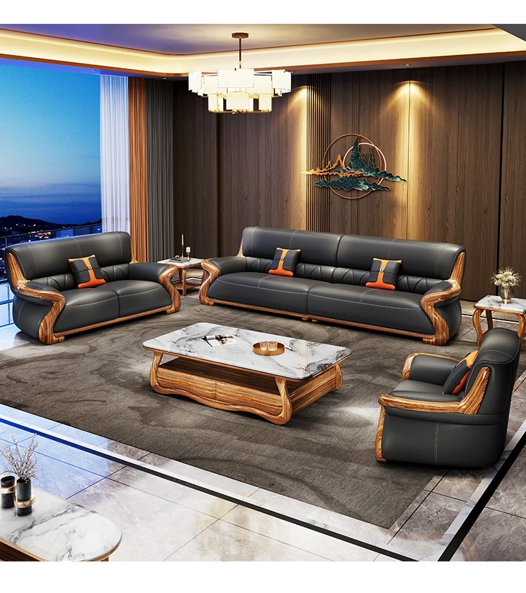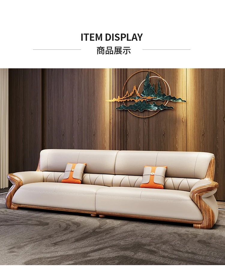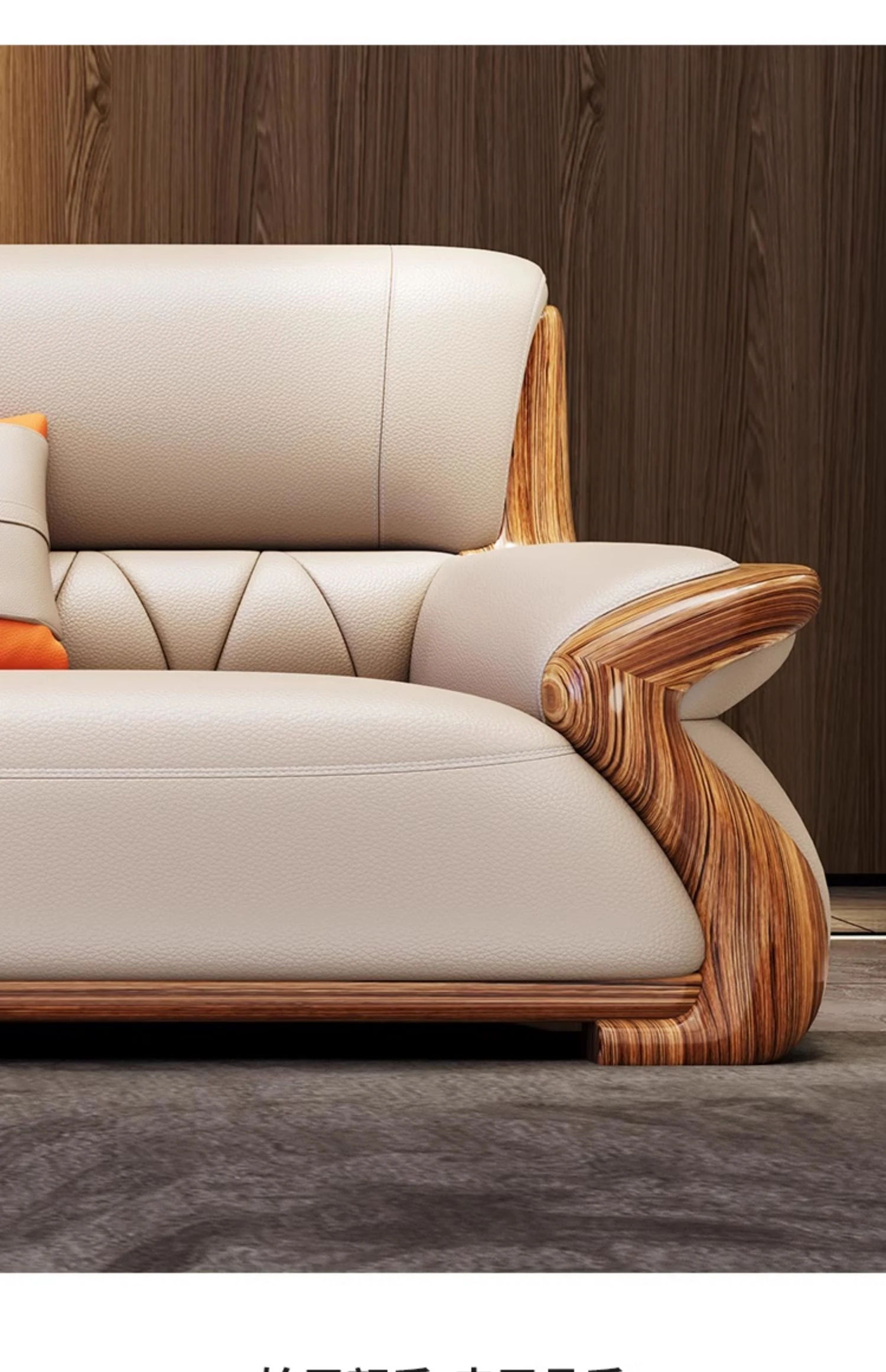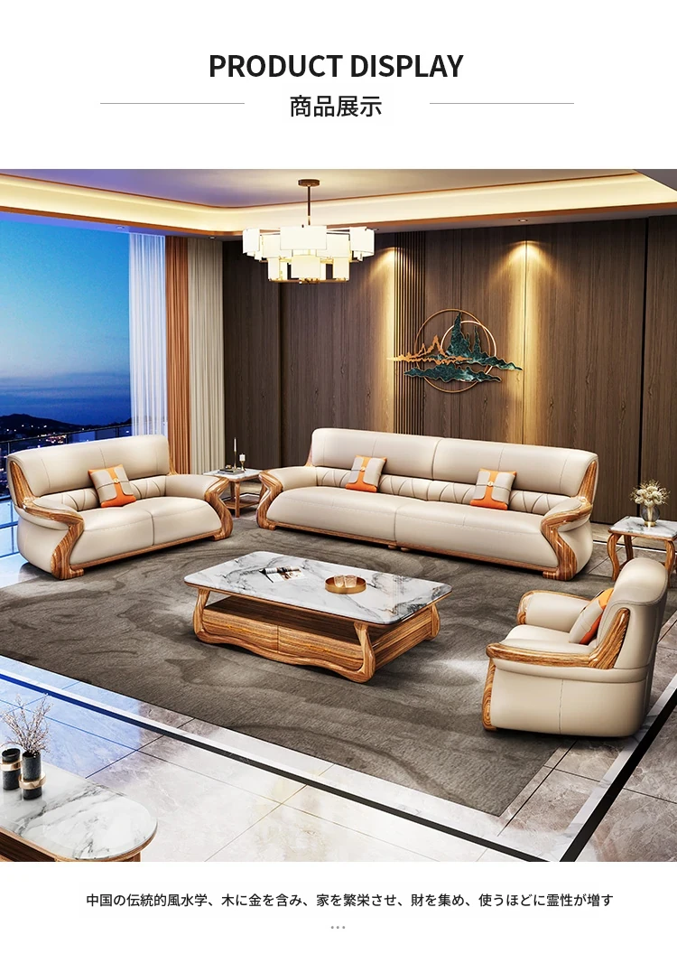 ウッドグレインレザーソファ1234組合 - 新中式デザインの高品質無垢材使用、モダンでシンプルな厚皮家具。リビングルームにぴったりの新作コンボ!