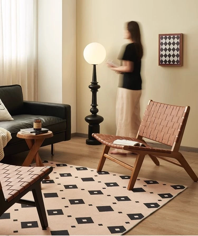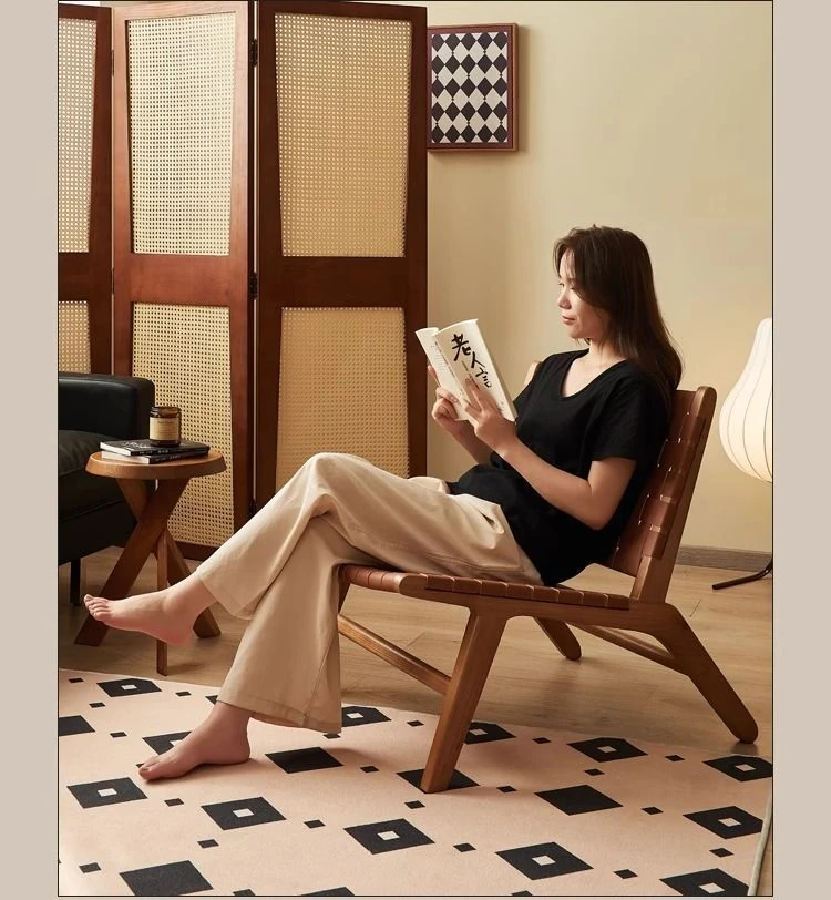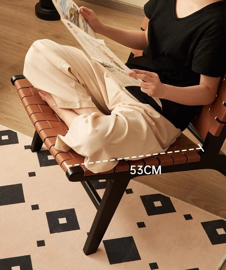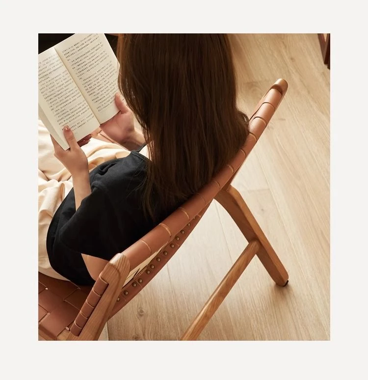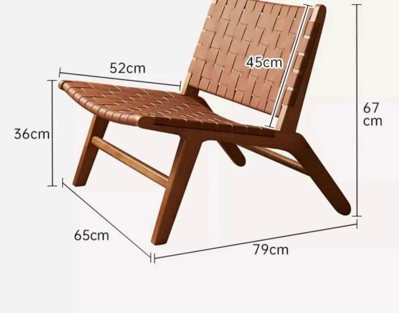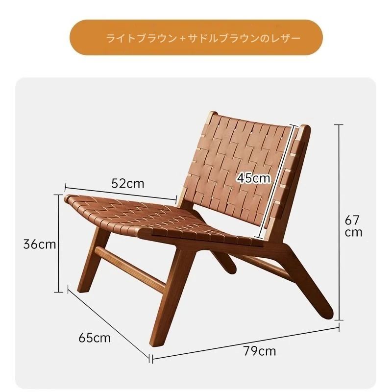 北欧風インスピレーションの天然木製サドルレザーリクライニングチェア - おしゃれなデザインで、リビングやバルコニーにぴったりのくつろぎソファ。クリエイティブなスタイルで、疲れた体を癒す最高のリラックス体験を提供します!