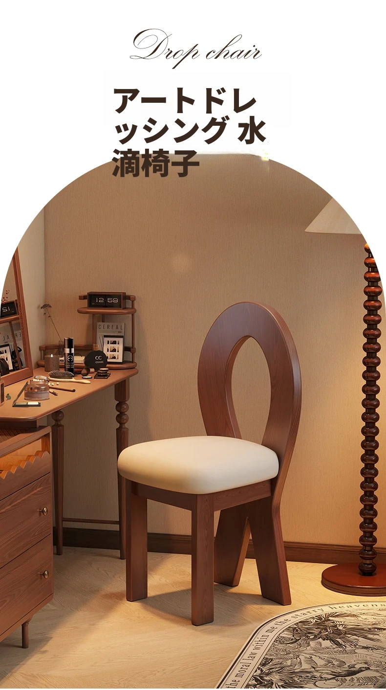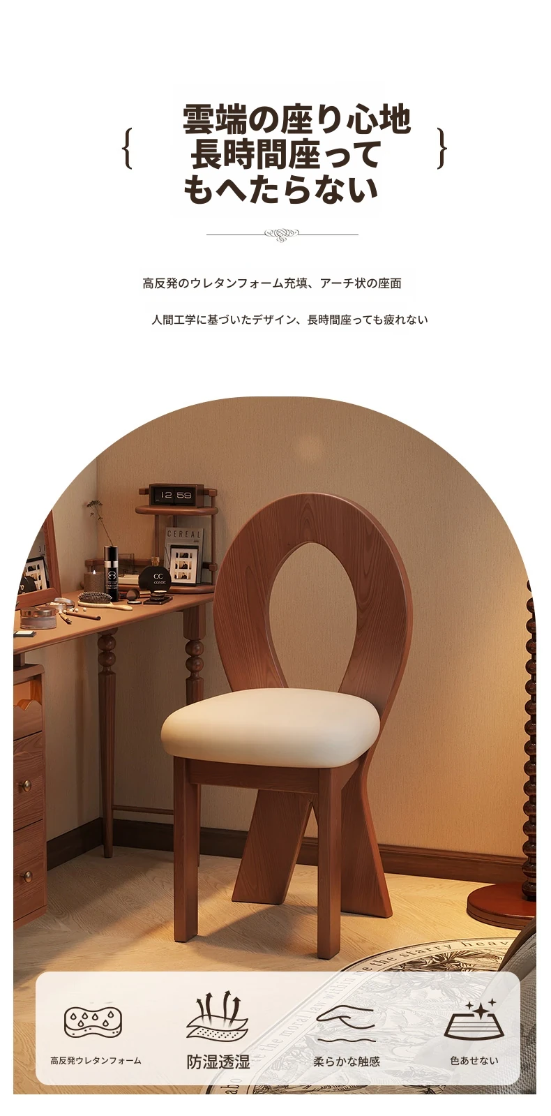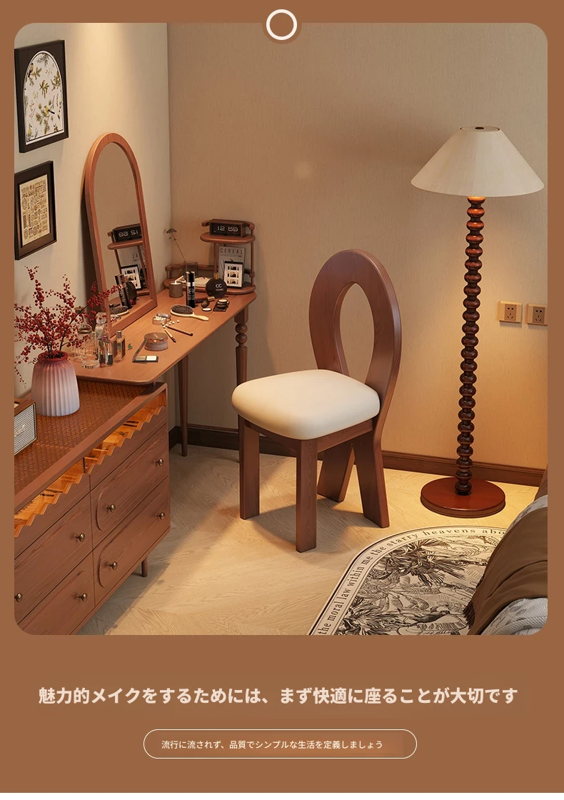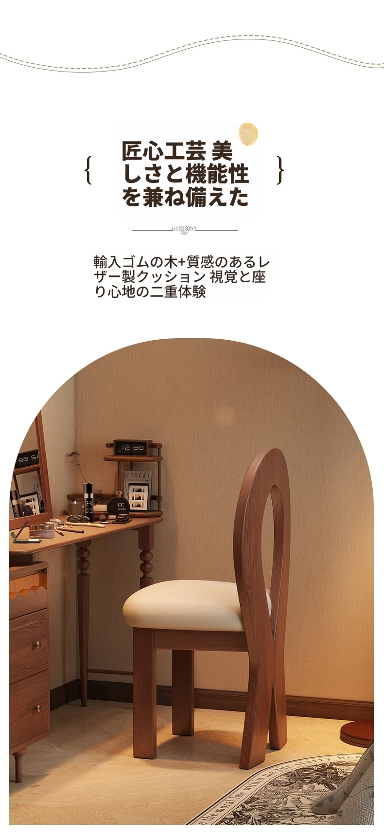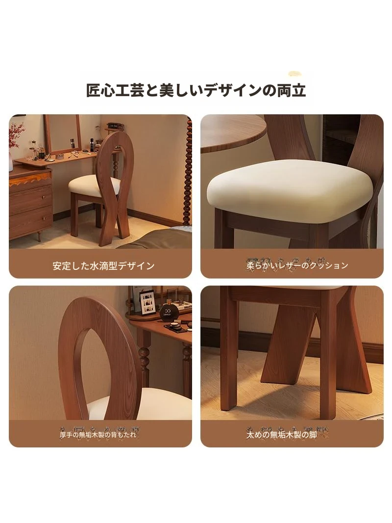 ヴィンテージ風無垢材ドレッシングチェア - 和の侘び寂びを感じる背もたれ付き、寝室にぴったりのラグジュアリーなフレンチスタイルメイクスツール。洗練されたデザインで、あなたの美容タイムを特別に演出します!