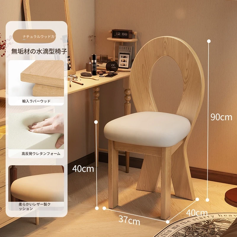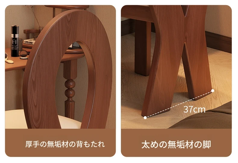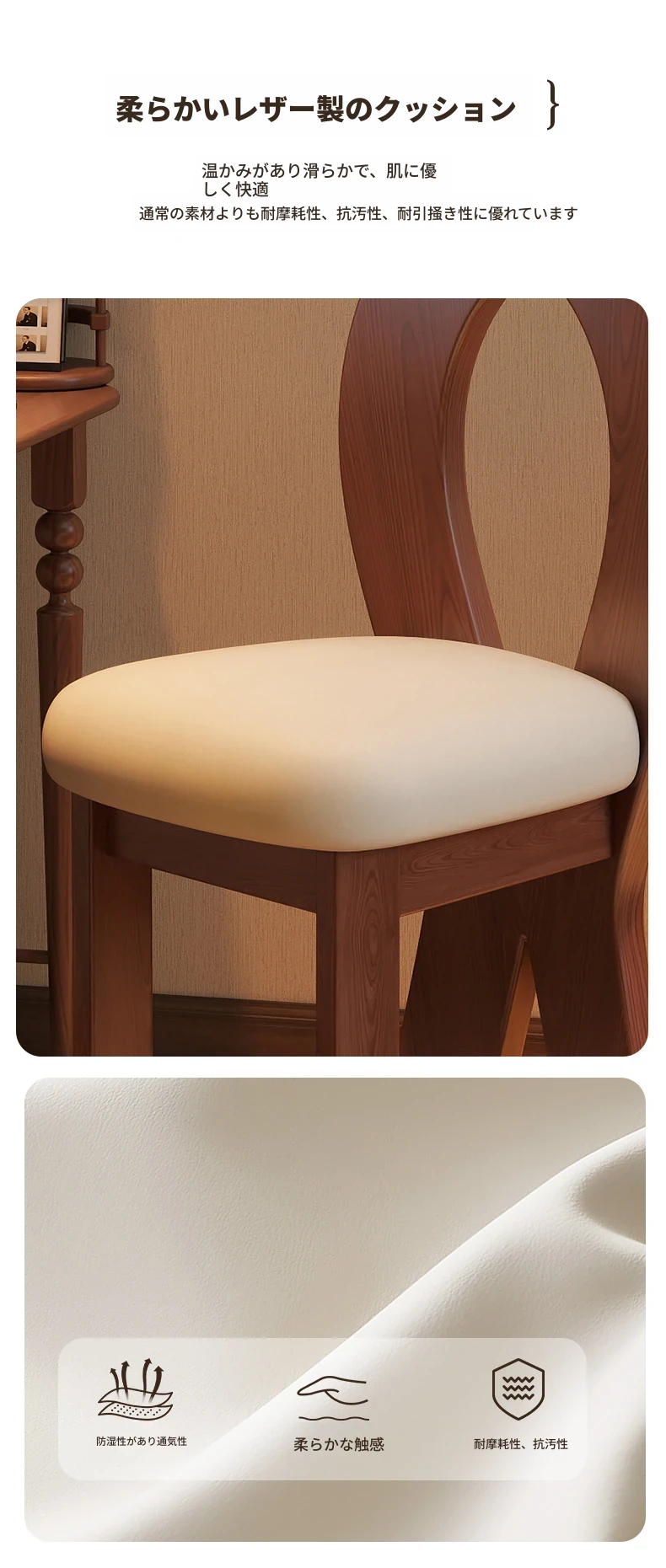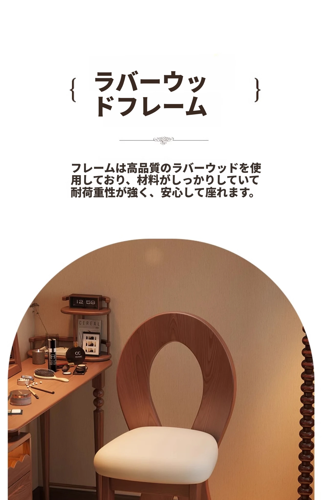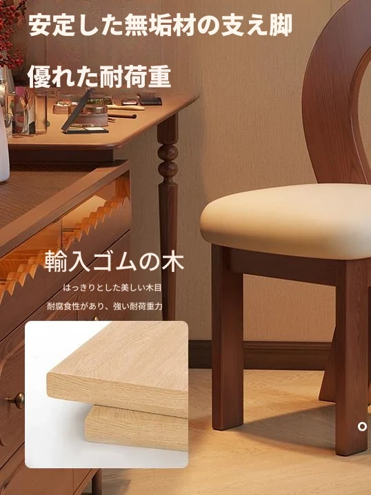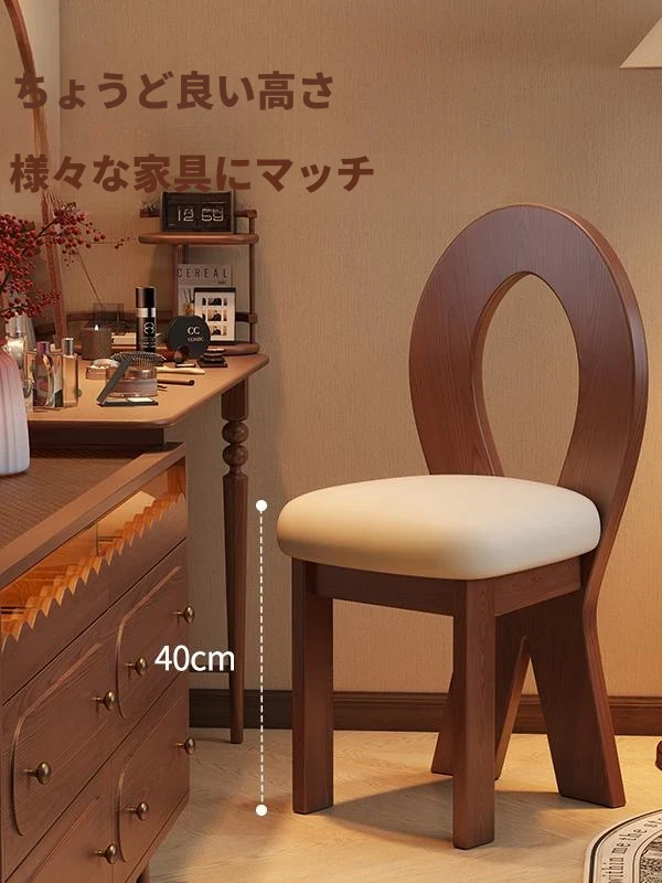 ヴィンテージ風無垢材ドレッシングチェア - 和の侘び寂びを感じる背もたれ付き、寝室にぴったりのラグジュアリーなフレンチスタイルメイクスツール。洗練されたデザインで、あなたの美容タイムを特別に演出します!