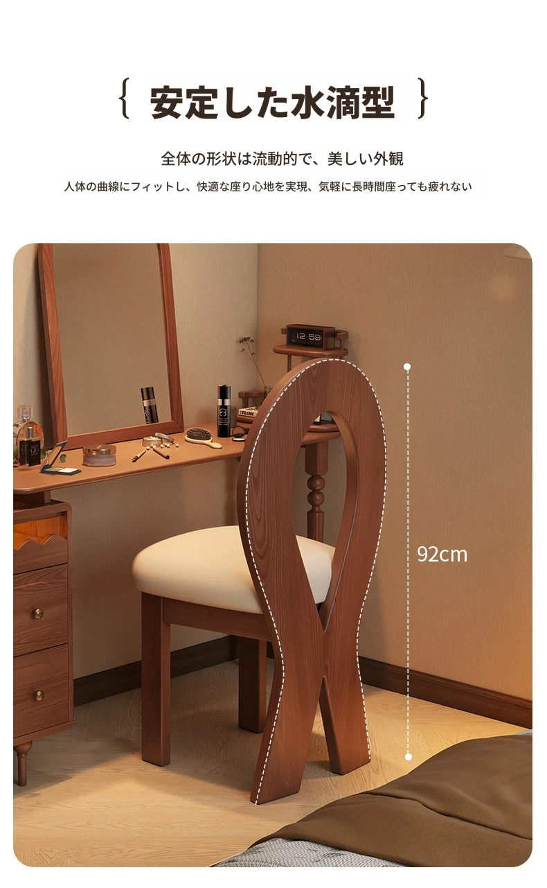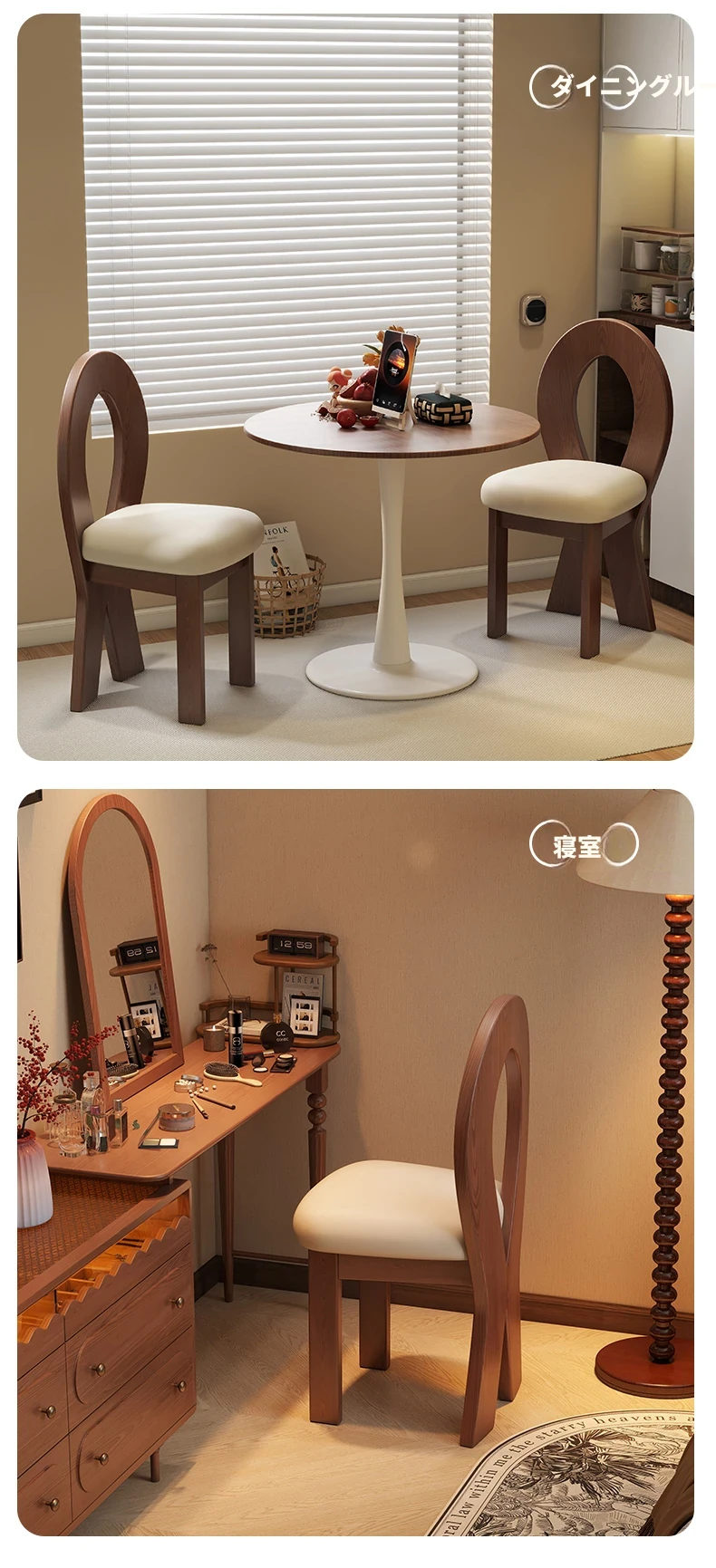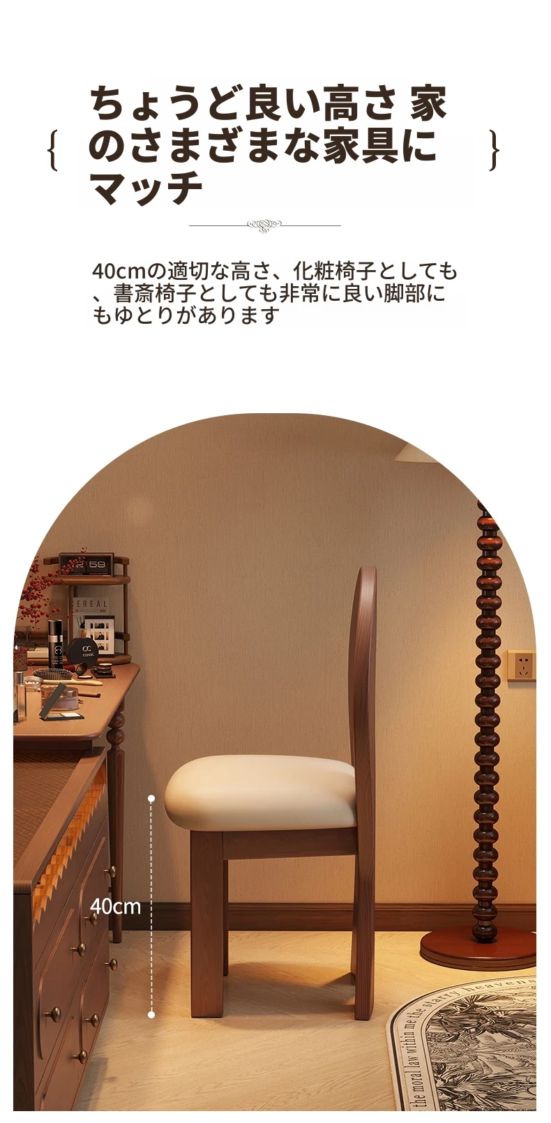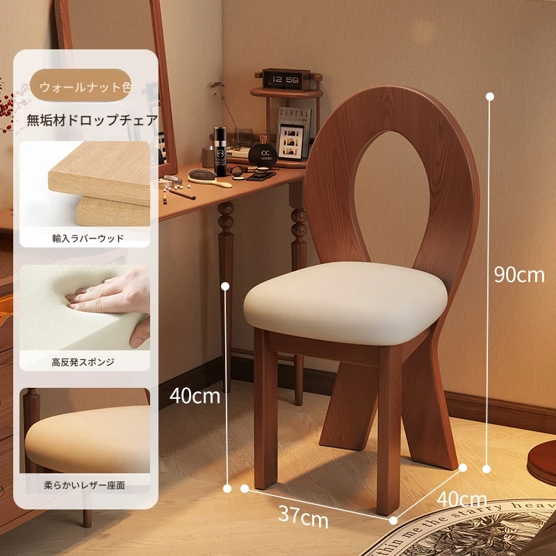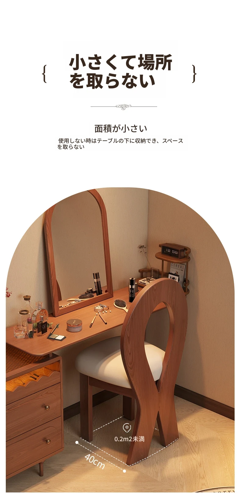 ヴィンテージ風無垢材ドレッシングチェア - 和の侘び寂びを感じる背もたれ付き、寝室にぴったりのラグジュアリーなフレンチスタイルメイクスツール。洗練されたデザインで、あなたの美容タイムを特別に演出します!