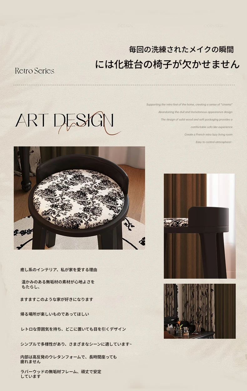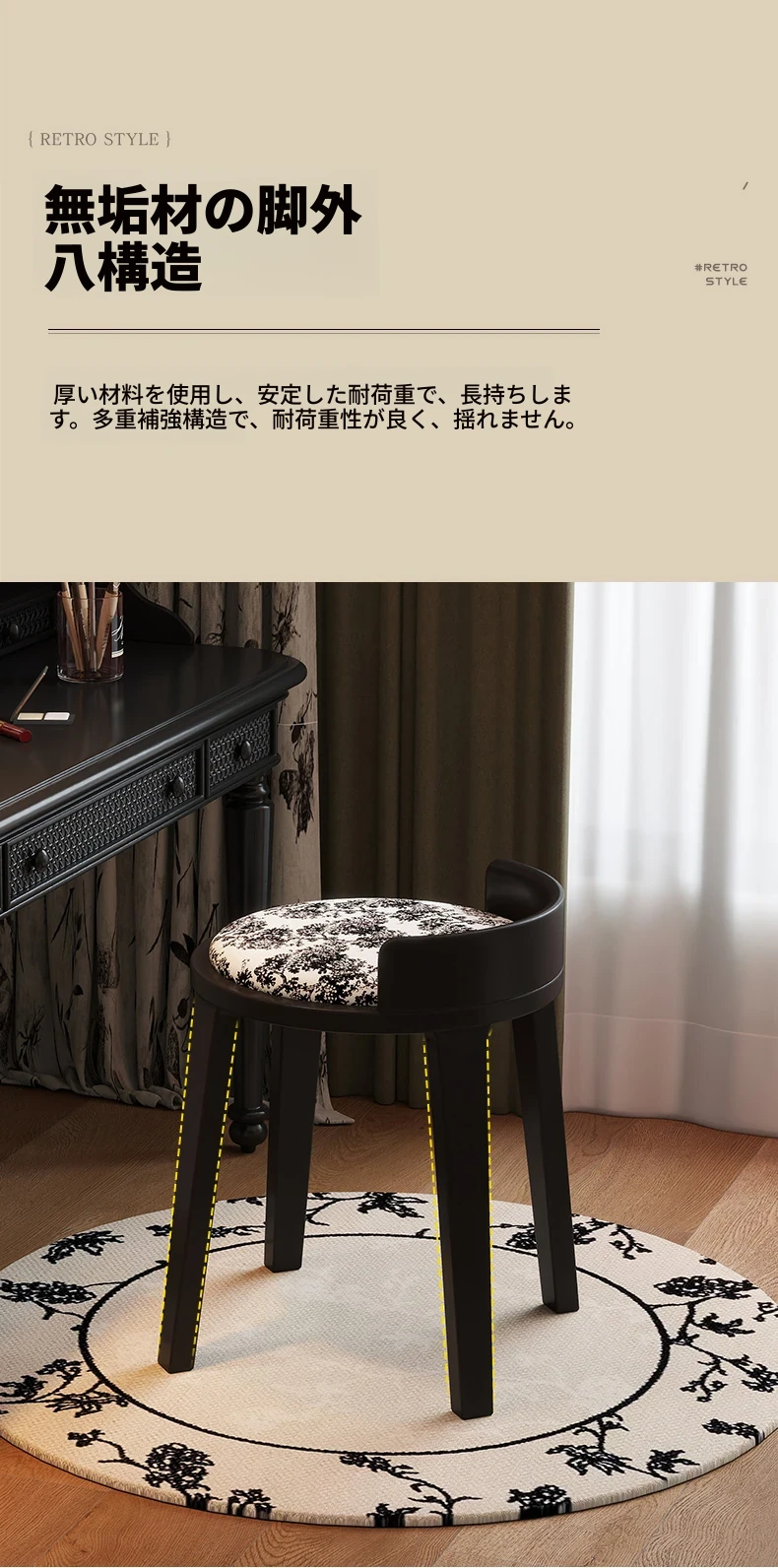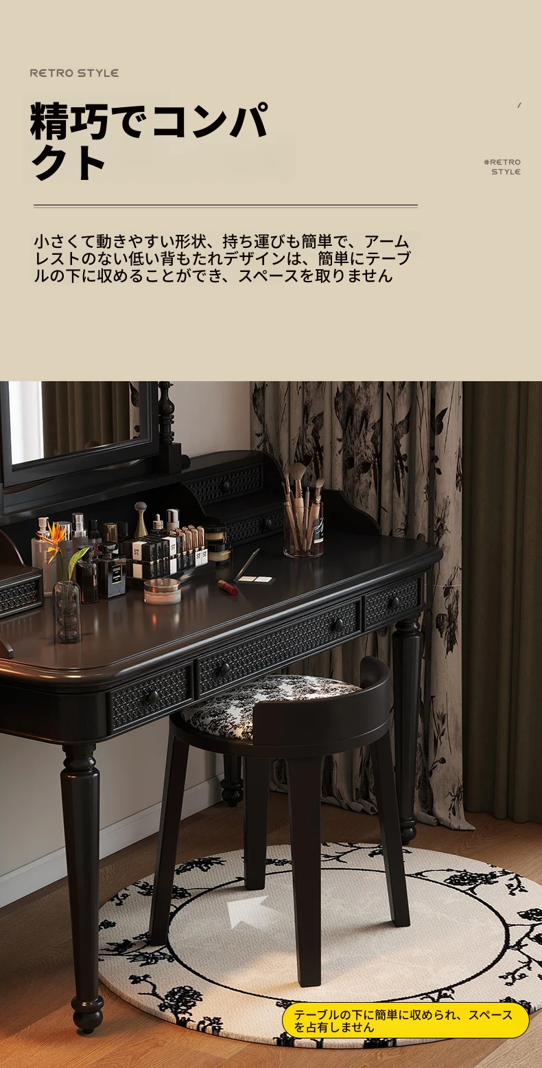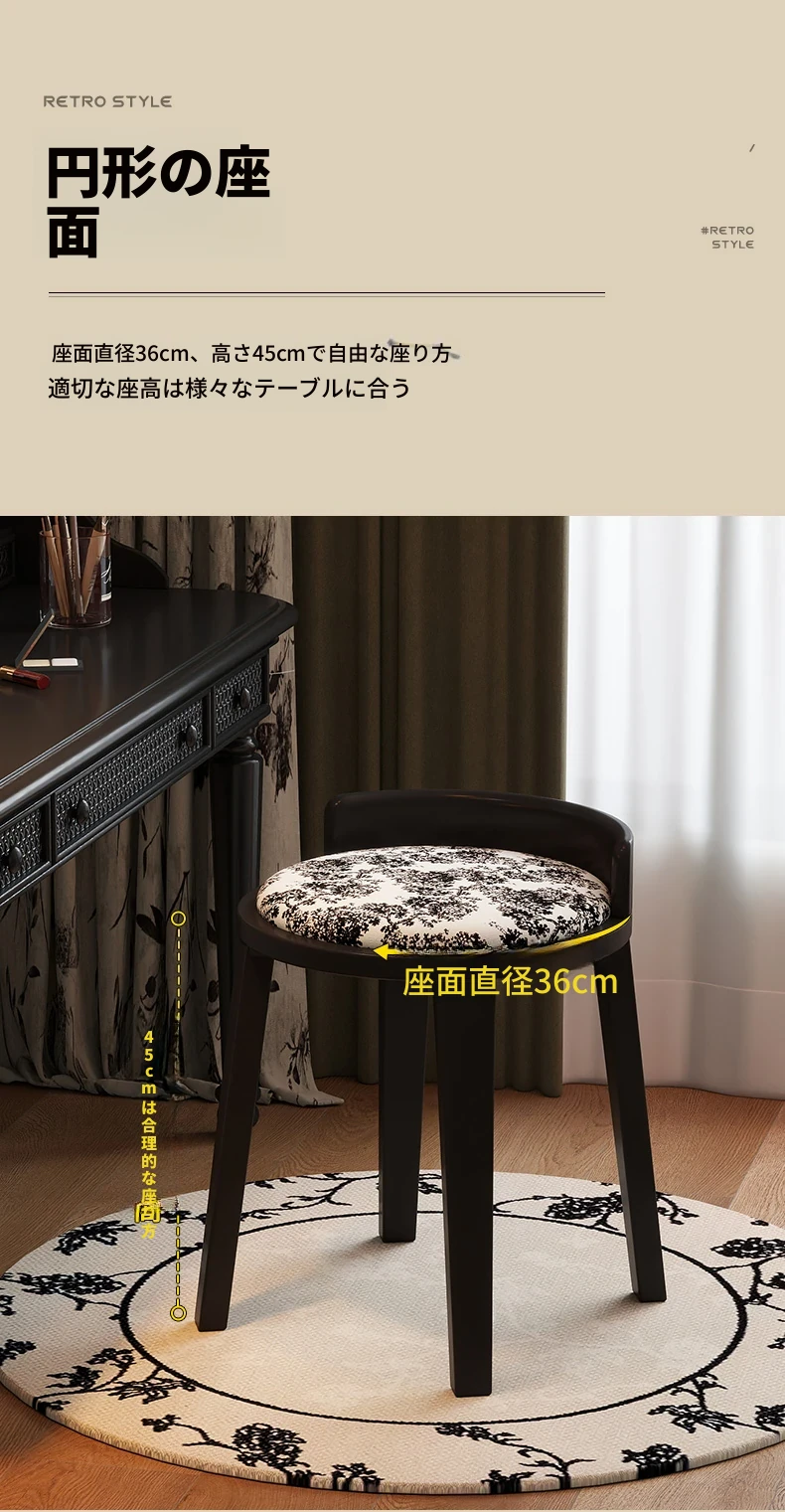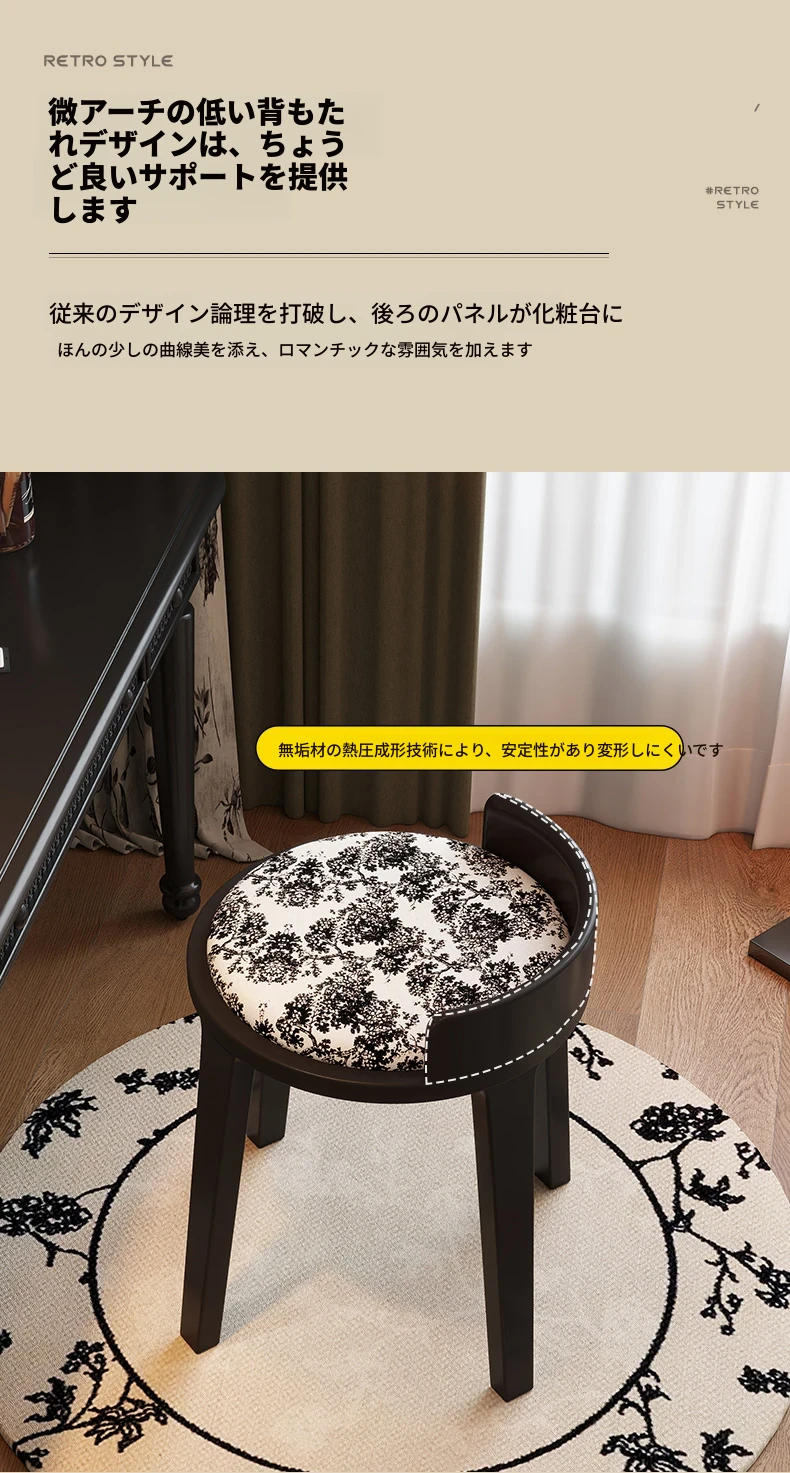 ヴィンテージ風の木製化粧椅子 - 女性の寝室にぴったりのスタイリッシュなドレッシングテーブル用背もたれ椅子。軽やかなラグジュアリー感を演出する、おしゃれなリビングにも合うレトロなデザインの椅子です。