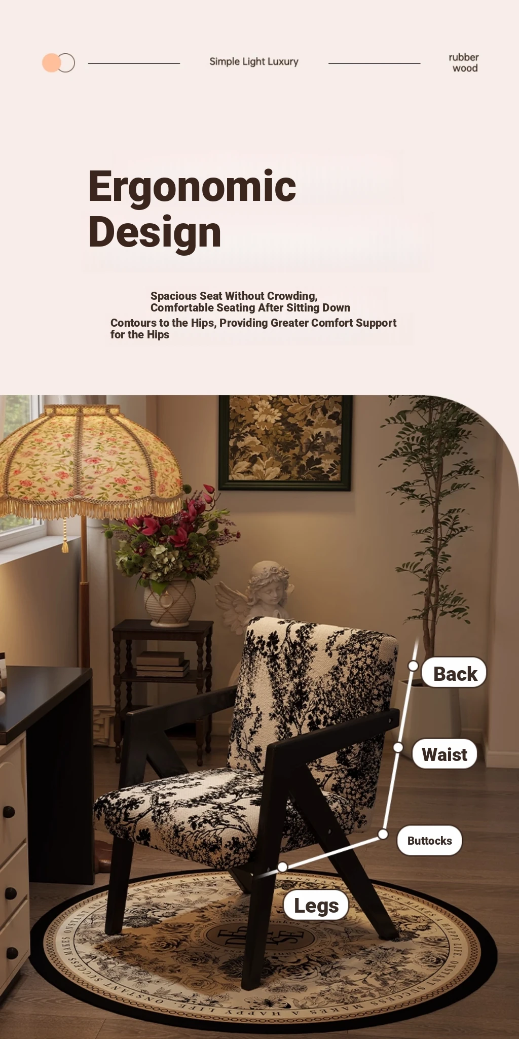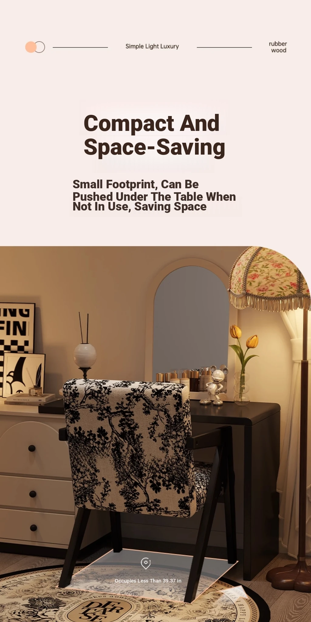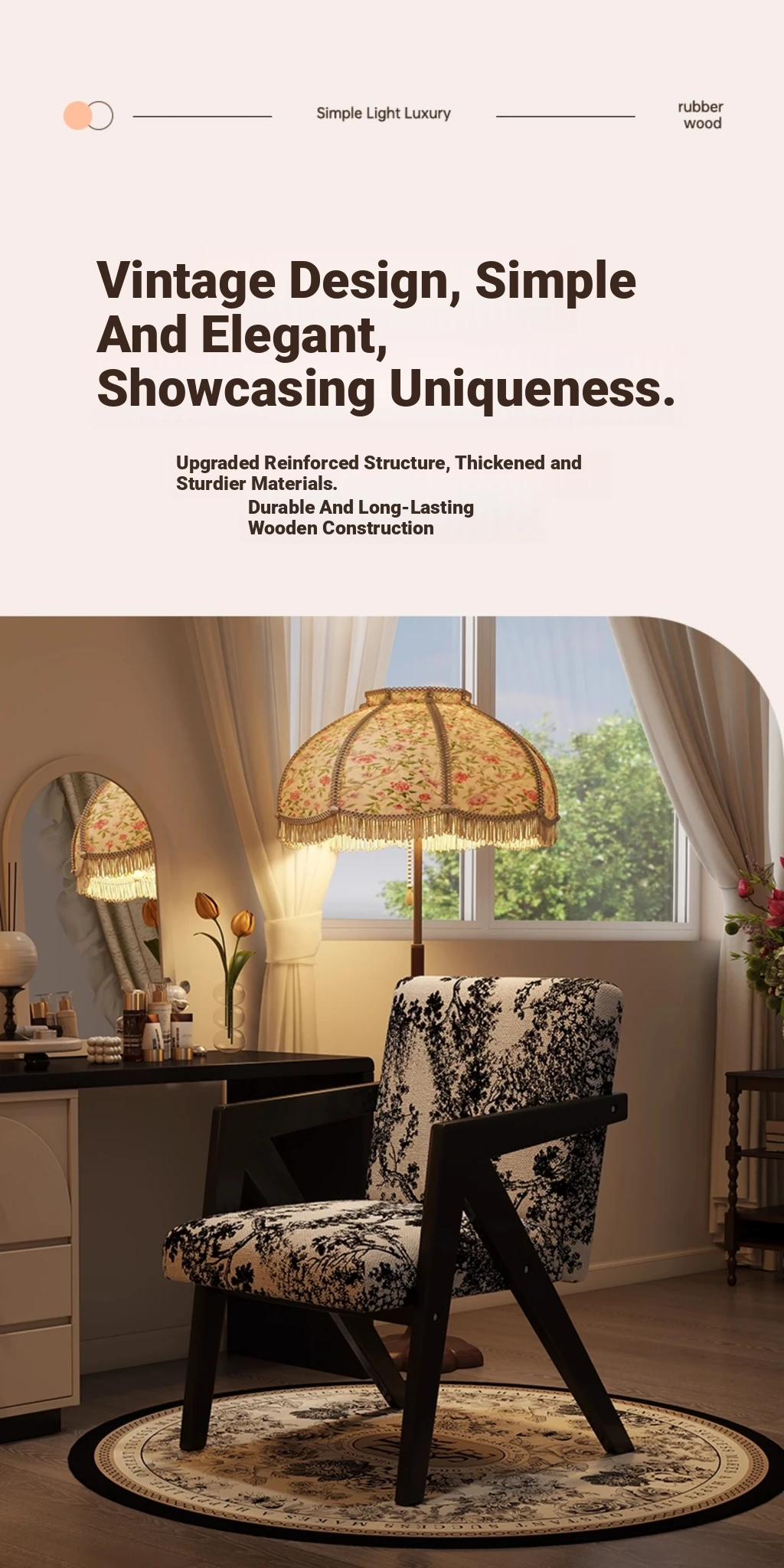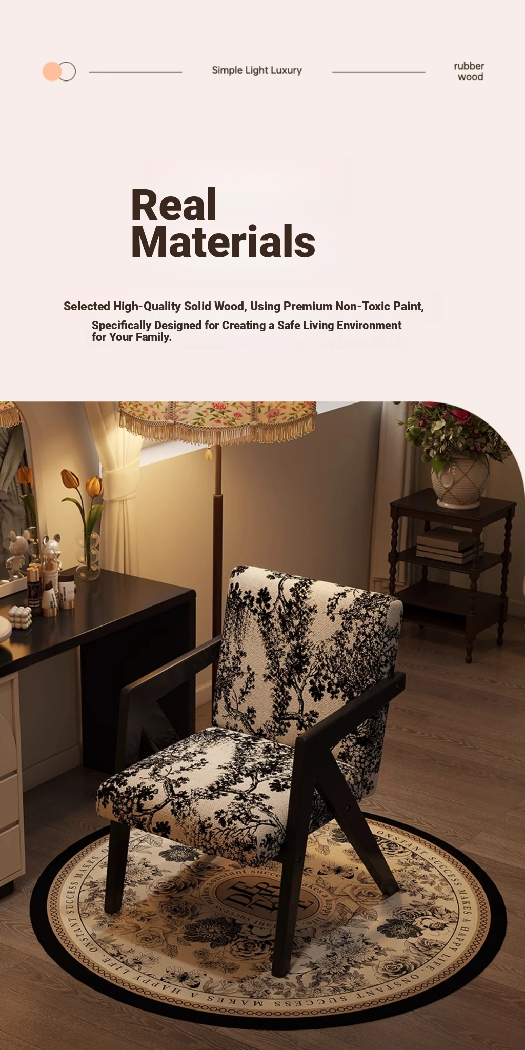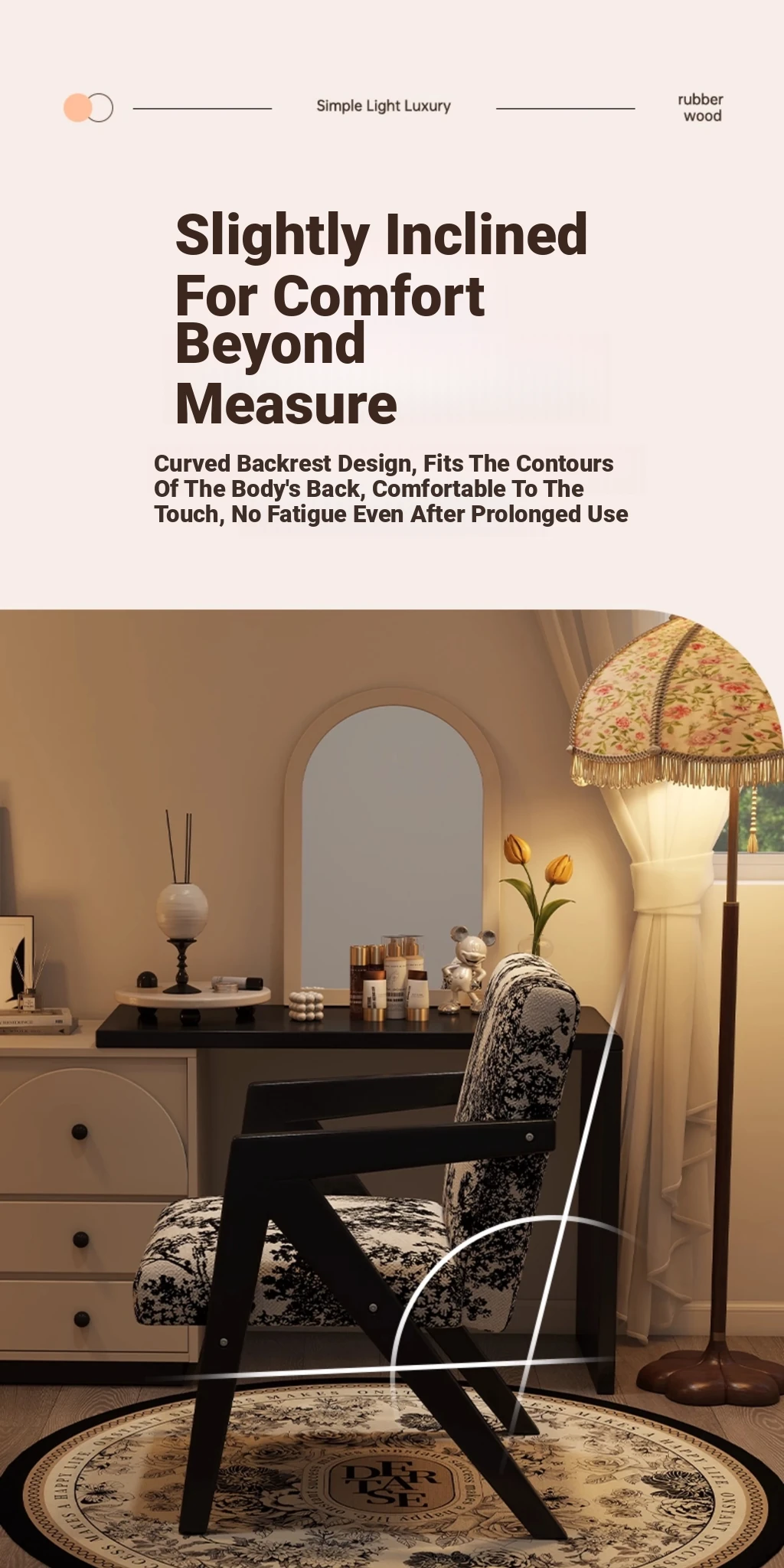 ヴィンテージ風の無垢材化粧台椅子|女性向け、背もたれ付き、リビングや寝室に最適な軽やかなラグジュアリー感|オフィスや書斎でも使えるおしゃれなデザイン!