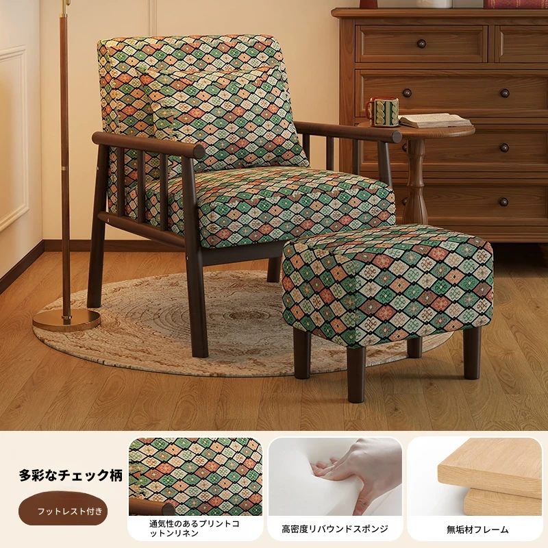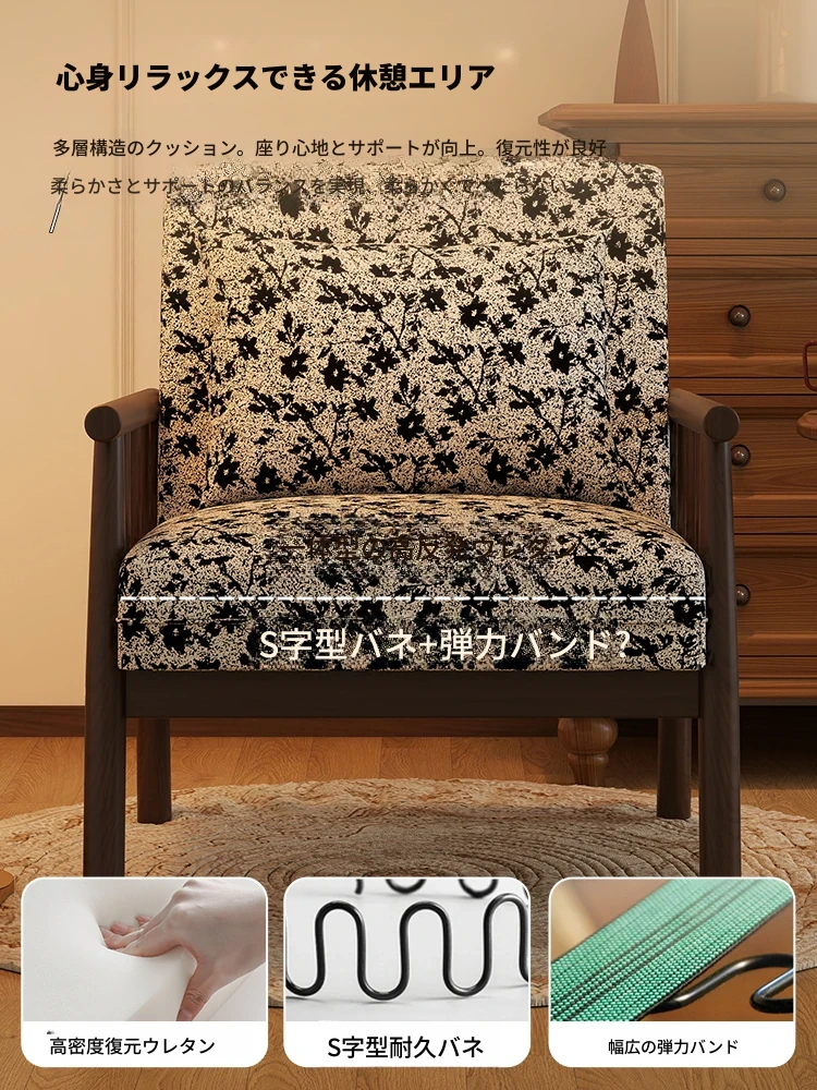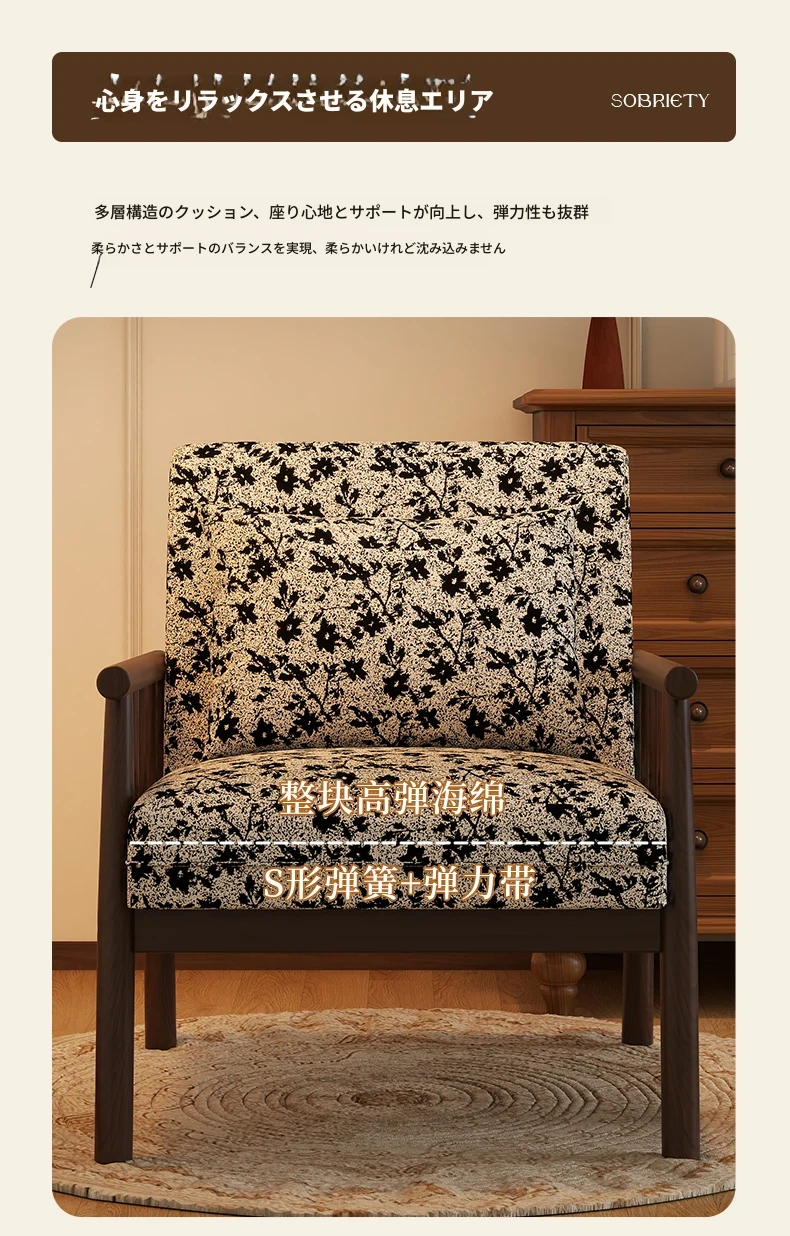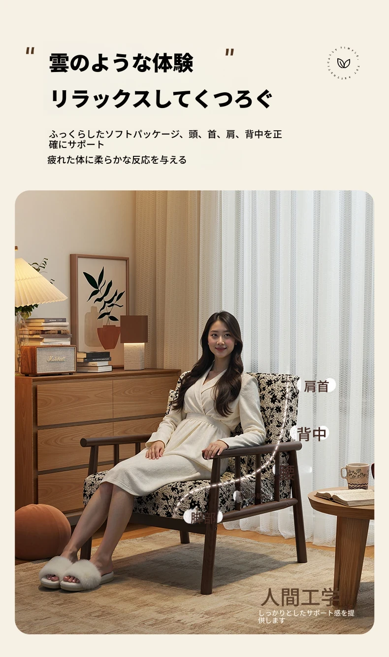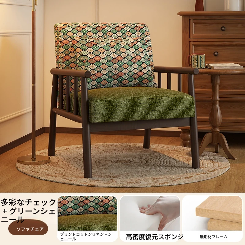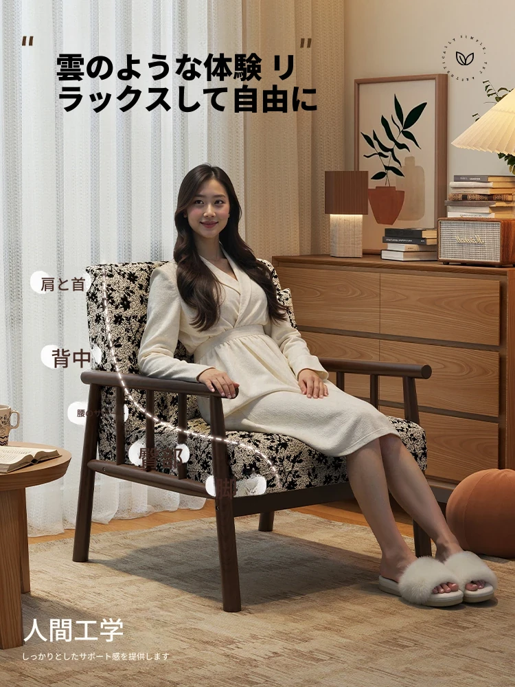 一人用ヴィンテージ風デザインのリラックスチェア - 無垢材製のレトロスタイル、リビングやバルコニーに最適な快適な背もたれ付き。あなたの空間に洗練された雰囲気をプラス!