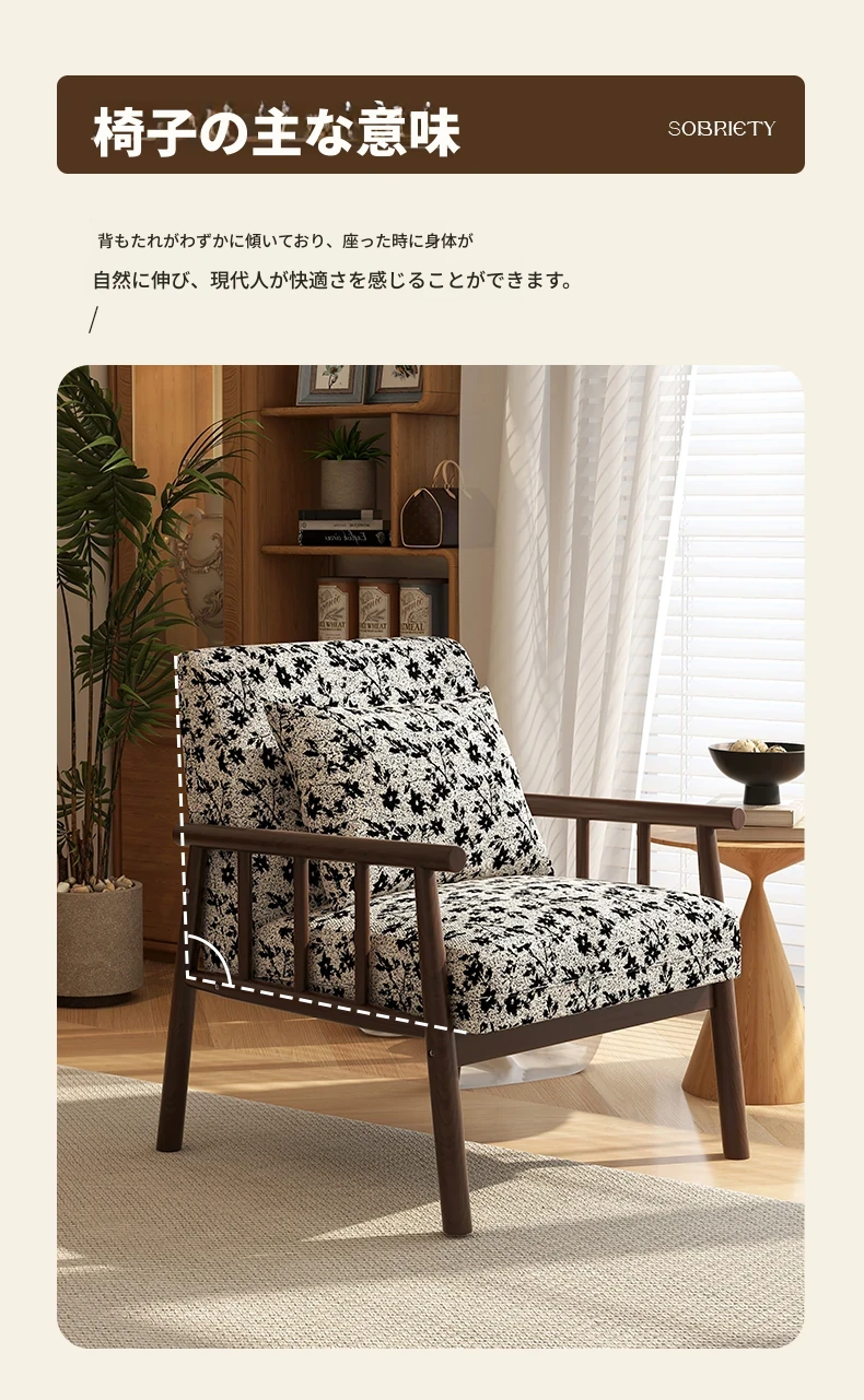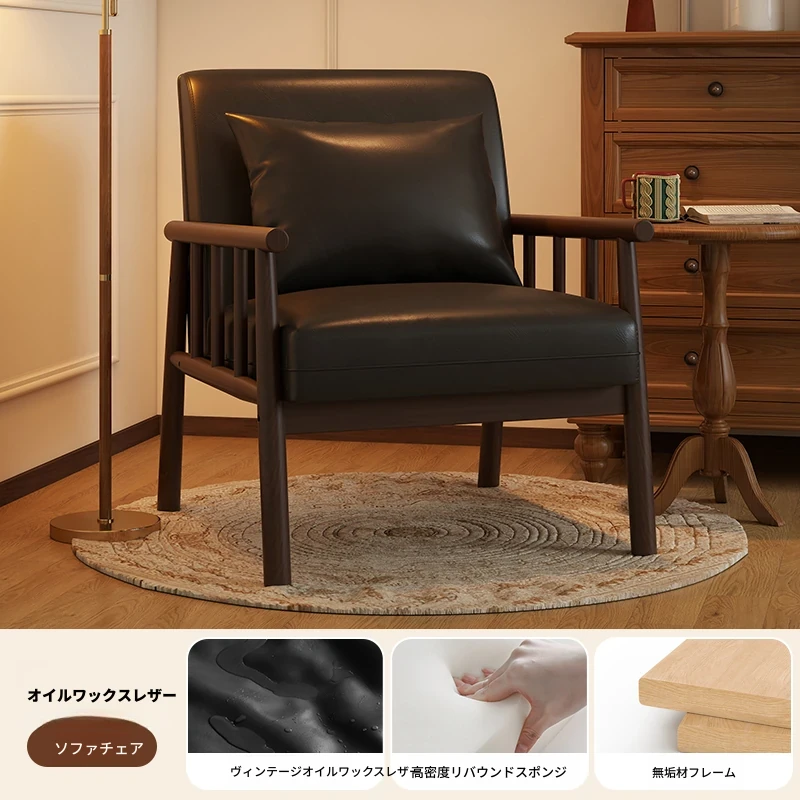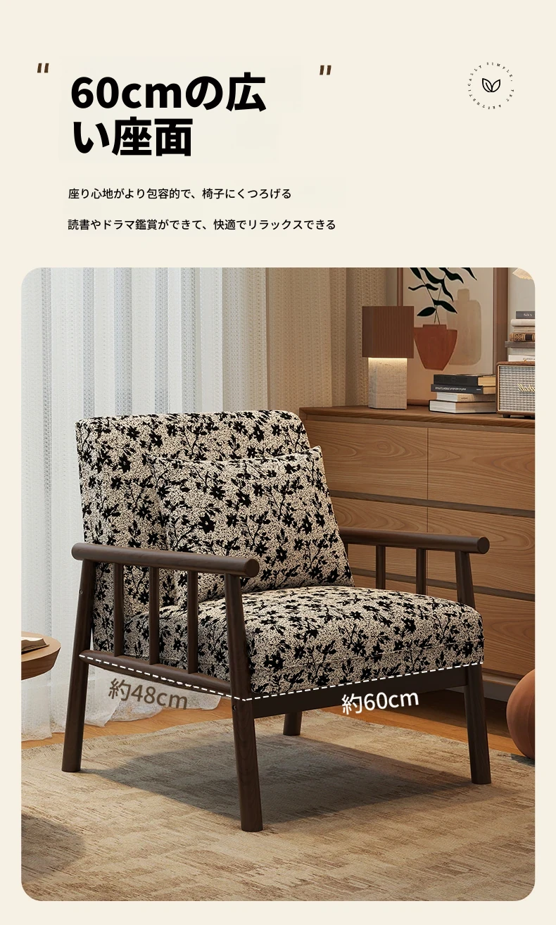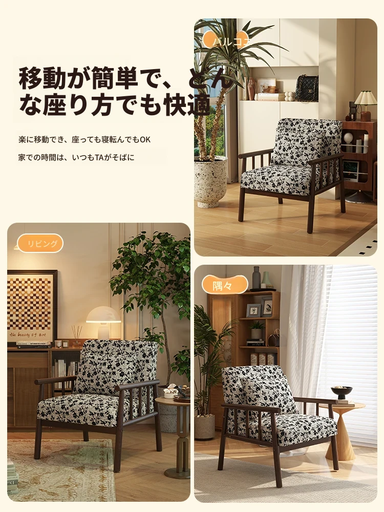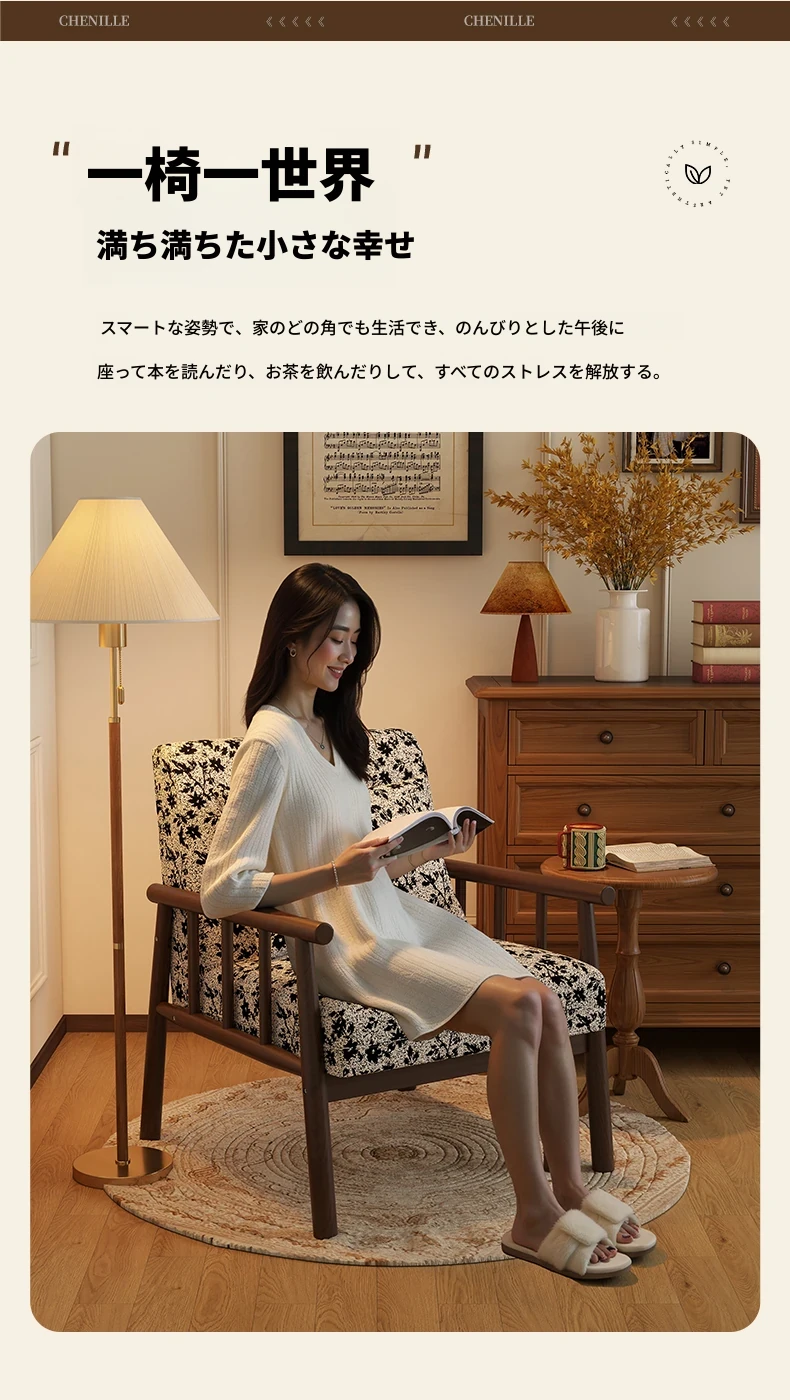 一人用ヴィンテージ風デザインのリラックスチェア - 無垢材製のレトロスタイル、リビングやバルコニーに最適な快適な背もたれ付き。あなたの空間に洗練された雰囲気をプラス!