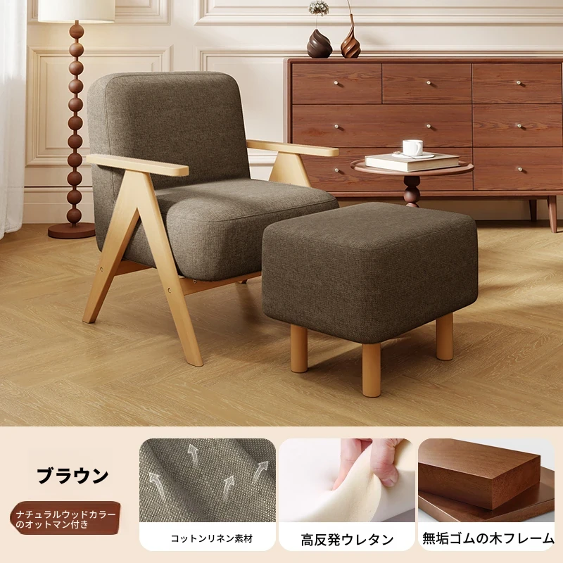 レトロブラウン+スツール【通気性のあるコットンリネン+ナチュラルウッドフレーム】